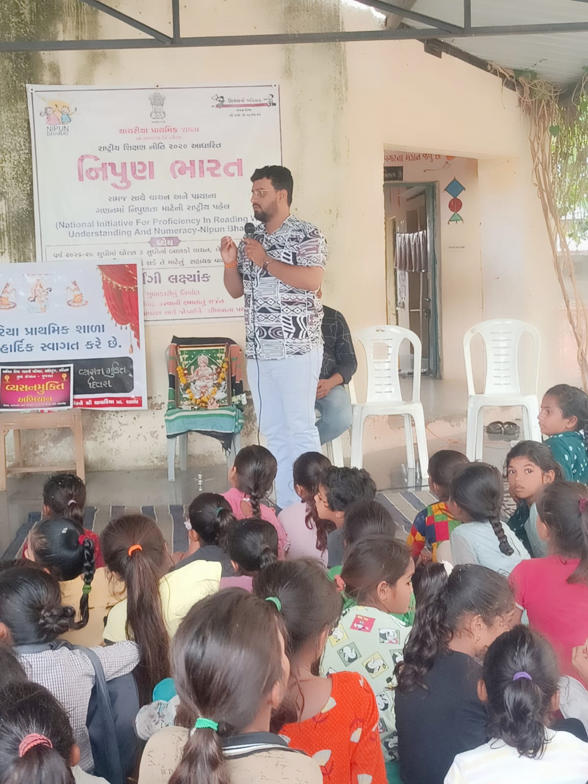 શાળા પરિવાર દ્વારા સમગ્ર શાળામાં વ્યસનમુક્તિનો દિવ્ય સંદેશો આપતાં વિવિધ બેનરોનું પ્રદર્શન અને પ્રેઝન્ટેશન ગોઠવવામાં આવ્યું છે તથા શાળા પરિવારના આચાર્ય શ્રી પ્રકાશભાઈ તથા તમામ  ગુરુજનો‌ સાથે  શાળાના ઈનોવેટિવ શિક્ષક અને કેળવણીકાર શ્રી પ્રવીણભાઈ ખાચર સાહેબ દ્વારા વ્યસનોથી દૂર રહેવા માટેની અને વ્યસનો કેવી રીતે વિનાશ તરફ દોરી જાય એની પ્રેરણાત્મક વાતો મુકી સૌને ઉત્તમ સંદેશો આપી તમામ બાળકોને આજીવન વ્યસનમુક્ત રહેવાનો અને ગળી સોપારી ન ખાવાનો સંકલ્પ લેવડાવ્યો હતો. દરેક બાળકો પોતાના ઘરમાં માત પિતા અને મોટા ભાઈઓમાં રહેલા પાન,માવા,બીડી,સિગરેટ, તમાકું,ગુટખા,જેવા વ્યસનો દુર કરાવવામાં માધ્યમ બનવા કટીબધ્ધ બનતાં ખરા અર્થમાં આ કાર્યક્રમ ખૂબ પ્રેરણાદાયી બની રહ્યો હતો.શાળા પરિસરમાં પ્રાથમિક તબક્કામાં બાળકોની કક્ષાએ ગોઠવાયેલા આ અભિયાનમાં આજુબાજુના અનેક વાલીઓ ભીની આંખે જોડાતાં ભાવુક દ્રશ્યો સર્જાયા હતાં.સૌ વાલીઓએ લાગણી સાથે વ્યસનમુક્તિની ગંભીરતા સમજીને  સમગ્ર પ્રદર્શન નિહાળ્યું હતું અને શાળા પરિવારના પ્રયાસને બીરદાવ્યો હતો