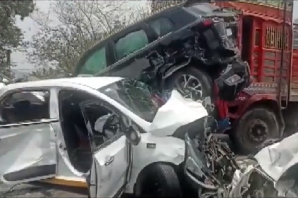 મુંબઈ-પુણે એક્સપ્રેસ વે પર ભીષણ અકસ્માત થયો છે. આ અકસ્માતમાં ૭થી ૮ ગાડીઓ પરસ્પર ટકરાઈ. રિપોર્ટ્સ મુજબ એક ટ્રક બેકાબૂ થવાના કારણે આ અકસ્માત થયો. આ અકસ્માત એટલો મોટો હતો તેનો અંદાજાે તસવીરોથી લગાવી શકાય છે. જેમાં ગાડીઓના ફૂરચા ઉડી ગયા. એક્સપ્રેસ વેના ખોપોલી એક્ઝિટ પાસે આ અક્સમાત થયો અને તેના કારણે લાંબો ટ્રાફિક જામ થઈ ગયો. હાલ રાહત અને બચાવ કાર્ય ચાલુ છે. એક્સપ્રેસ વે પર તૈનાત પોલીસ અને બચાવ દળની ટુકડી તરત જ ઘટનાસ્થળે પહોંચી ગઈ હતી. આ અકસ્માત પુણેથી મુંબઈ જનારી લેનમાં થયો છે જેમાં લગભગ ૧૧ લોકો ઘાયલ થયા છે. કેટલાક લોકોની સ્થિતિ ગંભીર પણ છે. આ અકસ્માતના કારણે પુણેથી મુંબઈ જતો ટ્રાફિક હાલ અટકેલો છે. આ અકસ્માતની પાછળ બેકાબૂ થયેલો ટ્રક કારણભૂત મનાય છે. પરંતુ હજુ તેની પુષ્ટિ થઈ નથી. પ્રશાસનનું કહેવું છે કે આ ઘટનાની તપાસ ચાલુ છે અને ત્યારબાદ જ જાણકારી આપવામાં આવશે. આ અકસ્માત એટલો ભીષણ હતો કે કાર ટકરાયા બાદ ટ્રક ઉપર ચડી ગઈ.