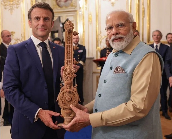 વડાપ્રધાન નરેન્દ્ર મોદી ફ્રાંસના પ્રવાસે છે. આ દરમિયાન તેણે શુક્રવારે ફ્રાન્સના રાષ્ટ્રપતિ ઈમેન્યુઅલ મેક્રોનને ભેટ તરીકે ચંદનની સિતાર આપી હતી. પીએમ મોદીએ ફ્રાન્સના રાષ્ટ્રપતિની પત્ની, ફ્રાન્સના વડાપ્રધાન, ફ્રાન્સની સેનેટના પ્રમુખ અને ફ્રેન્ચ નેશનલ એસેમ્બલીના પ્રમુખને પણ ભેટ આપી હતી. રાષ્ટ્રપતિ મેક્રોનને ભેટમાં આપેલા સંગીતના વાદ્ય સિતારની આ અનોખી પ્રતિકૃતિ શુદ્ધ ચંદનથી બનેલી છે. એવું કહેવાય છે કે ચંદનની કોતરણીની કળા એક ઉત્કૃષ્ટ અને પ્રાચીન હસ્તકલા છે, જે દક્ષિણ ભારતમાં સદીઓથી પ્રચલિત છે. આ સુશોભિત પ્રતિકૃતિમાં દેવી સરસ્વતીની છબીઓ છે, જે શિક્ષણ, સંગીત, કળા, વાણી, જ્ઞાન અને વિદ્યાની દેવી છે, જેમાં સિતાર (વીણા) નામનું સંગીત વાદ્ય છે. તેની સાથે ભગવાન ગણેશની પ્રતિમા પણ બિરાજમાન છે. સિતાર પર રાષ્ટ્રીય પક્ષી મોરને પણ સ્થાન આપવામાં આવ્યું છે, જે સુંદર રીતે કોતરવામાં આવ્યું છે અને ભારતીય સંસ્કૃતિના અસંખ્ય અભિવ્યક્તિઓ દર્શાવે છે. ફ્રાન્સની તેમની સત્તાવાર મુલાકાત દરમિયાન, પીએમ મોદીએ ફ્રાન્સના નેતાઓને આપવામાં આવેલી ભેટોની શ્રેણી દ્વારા ભારતના સમૃદ્ધ સાંસ્કૃતિક વારસાનું પ્રદર્શન કર્યું. આ ભેટોએ માત્ર ભારતની કારીગરી અને કલાત્મક પરંપરાની જ ઉજવણી કરી નથી, પરંતુ બંને દેશો વચ્ચે મિત્રતા અને પરસ્પર સમજણના બંધનને પણ મજબૂત બનાવ્યું છે. પીએમ મોદીએ રાષ્ટ્રપતિ મેક્રોન સાથે સંયુક્ત પત્રકાર પરિષદ યોજી હતી, જેમાં તેમણે ભવ્ય સ્વાગત માટે મેક્રોનનો આભાર માન્યો હતો. તેમજ ફ્રાન્સના લોકોને તેમના રાષ્ટ્રીય દિવસની શુભેચ્છા અને અભિનંદન પાઠવ્યા હતા. પીએમ મોદીએ કહ્યું કે ગઈકાલે રાષ્ટ્રપતિ મેક્રોને તેમને ફ્રાન્સના સર્વશ્રેષ્ઠ રાષ્ટ્રીય પુરસ્કારથી સન્માનિત કર્યા. આ સન્માન ૧૪૦ કરોડ ભારતીયોનું સન્માન છે. પીએમએ કહ્યું કે અમે અમારી વ્યૂહાત્મક ભાગીદારીની ૨૫મી વર્ષગાંઠની ઉજવણી કરી રહ્યા છીએ. છેલ્લા ૨૫ વર્ષના મજબૂત આધાર પર અમે આવનારા ૨૫ વર્ષનો રોડમેપ તૈયાર કરી રહ્યા છીએ. આમાં બોલ્ડ અને મહત્વાકાંક્ષી લક્ષ્યો નક્કી કરવામાં આવી રહ્યા છે.