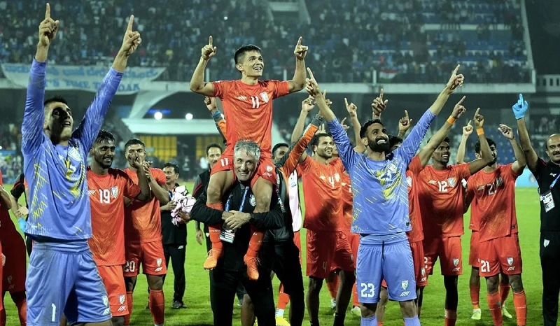 મેજબાન ભારતે કુવૈતને પેનલ્ટી શૂટઆઉટમાં ૫-૪થી હરાવીને નવમી વાર સૈફ ફુટબૉલ ચેમ્પિયનશિપ જીત લીધી છે. આ જીત સાથે જ ભારતીય ટીમે પોતાની હૈટ્રિક પુરી કરી છે. તે આ ટૂર્નામેન્ટ પહેલા નેશંસ કપ અને ઈંટરકોન્ટિનેંટલ કપ જીતી ચુકી છે. ભારતીય ટીમની જીત બાદ સ્ટેડિયમમાં જે નજારો જાેવા મળ્યો તો, ફેન્સને વર્ષોના વર્ષ સુધી યાદ રહેશે. લગભગ ૩૦ હજાર ફેન્સ ભારત અને કુવૈત વચ્ચે આ રોમાંચક ફાઈનલ મેચ જાેવા બેંગલુરુના કાંતિરાવ સ્ટેડિયમમાં પહોંચ્યા હતા. મેચ ખતમ થતાં જ સુનીલ છેત્રી ફેન્સનું અભિવાદન કરવા લાગ્યા. ત્યારે આખા સ્ટેડિયમમાં વંદે માતરમ ગુંજવા લાગ્યું. છેત્રી અને ફેન્સ એક સાથે આ ગીત ગાતા જાેઈ શકાય છે. ધીમે ધીમે ટીમ ઈંડિયા પણ ફેન્સ સાથે મા તુઝે સલામ ગીત ગાતા જાેઈ શકાય છે. ચારેતરફ ફક્ત દેશભક્તિનો નજારો જાેવા મળી રહ્યો છે. સોશિયલ મીડિયા પર આ વીડિયો ઝડપથી વાયરલ થઈ રહ્યો છે. મેચ બાદ સુનીલ છેત્રીએ ફેન્સનો આભાર વ્યક્ત કર્યો હતો. તેણે બેંગલુરુના દર્શકોના આ રોમાંચક મેચમાં જુસ્સો વધારવા માટે આભાર વ્યક્ત કર્યો. છેત્રીએ જણાવ્યું કે, આ મેચ આસાન નહોતી, પણ ફેન્સે ચીયર કરવામાં કોઈ કમી નહોતી રાખી. છેત્રી બેંગલુરુ એફસી માટે રમે છે. ગોલકીપર ગુરપ્રીત સિંહ સંધૂએ ડાઈવ લગાવીને નિર્ણાયક પેનલ્ટી બચાવી અને ભારતે મંગળવારે કુવૈતને શૂટઆઉટમાં ૫-૪થી હરાવીને નવમી વાર સૈફ ફુટબોલ ચેમ્પિયનશિપ ખિતાબ જીત્યો. બંને ટીમે ૧૨૦ મિનિટની રમત સુધી ૧-૧થી બરાબરાની ઈનિંગ્સ રમી હતી. પેનલ્ટી શૂટઆઉટના પાંચ રાઉન્ડ બાદ પણ સ્કોર ૪-૪ હતો, જે બાદ સડન ડૈથ પર ર્નિણય થયો. મહેશ નોરેમે સ્કોર કર્યો અને ભારતના ગોલકીપર ગુરપ્રીત સંધૂએ ડાઈવ લગાવીને ખાલિદ હાજિયાને શોટ બચાવીને મેચ જીત લીધી.