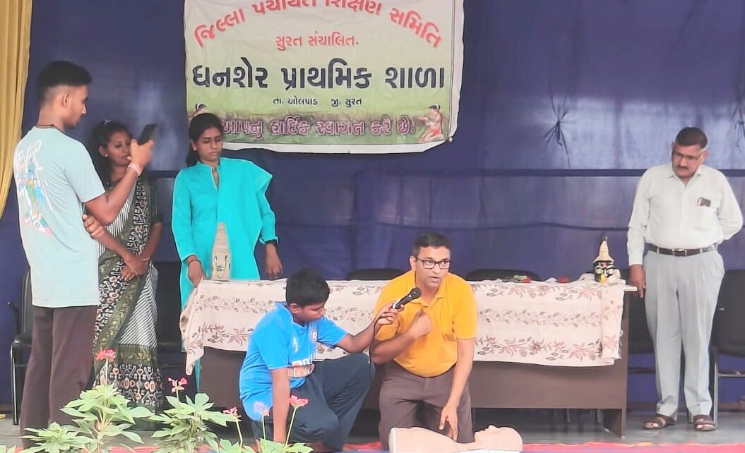 સમગ્ર ગુજરાત રાજ્ય અને દેશમાં યુવાનોમાં વધતાં જતાં હાર્ટ એટેકનાં બનાવો ચિંતાજનક આગળ વધી રહ્યાં છે. સુરતમાં પણ ડાન્સ કરતી વખતે, જીમમાં કસરત કરતી વખતે અને ખાસ કરીને યુવાનો ક્રિકેટ રમતા હોય ત્યારે યુવાનોમાં હૃદય બંધ થવાનાં કેસ કૂદકે ને ભૂસકે વધી રહ્યાં છે. વધતાં જતાં હાર્ટ એટેકનાં બનાવોને લઈ સ્વાસ્થ્ય અને સલામતીનાં ભાગરૂપે કાંઠા વિસ્તારમાં આવેલા ઓલપાડ તાલુકાનાં ધનશેર ગામ પરિવાર દ્વારા ધનશેર પ્રાથમિક શાળા ખાતે ગામનાં યુવાનો માટે CPR તાલીમનું આયોજન કરવામાં આવ્યું હતું.