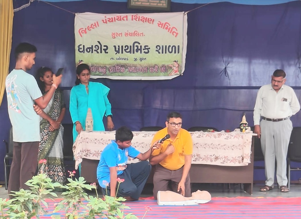 સમગ્ર ગુજરાત રાજ્ય અને દેશમાં યુવાનોમાં વધતાં જતાં હાર્ટ એટેકનાં બનાવો ચિંતાજનક આગળ વધી રહ્યાં છે. સુરતમાં પણ ડાન્સ કરતી વખતે, જીમમાં કસરત કરતી વખતે અને ખાસ કરીને યુવાનો ક્રિકેટ રમતા હોય ત્યારે યુવાનોમાં હૃદય બંધ થવાનાં કેસ કૂદકે ને ભૂસકે વધી રહ્યાં છે. વધતાં જતાં હાર્ટ એટેકનાં બનાવોને લઈ સ્વાસ્થ્ય અને સલામતીનાં ભાગરૂપે કાંઠા વિસ્તારમાં આવેલા ઓલપાડ તાલુકાનાં ધનશેર ગામ પરિવાર દ્વારા ધનશેર પ્રાથમિક શાળા ખાતે ગામનાં યુવાનો માટે CPR તાલીમનું આયોજન કરવામાં આવ્યું હતું.