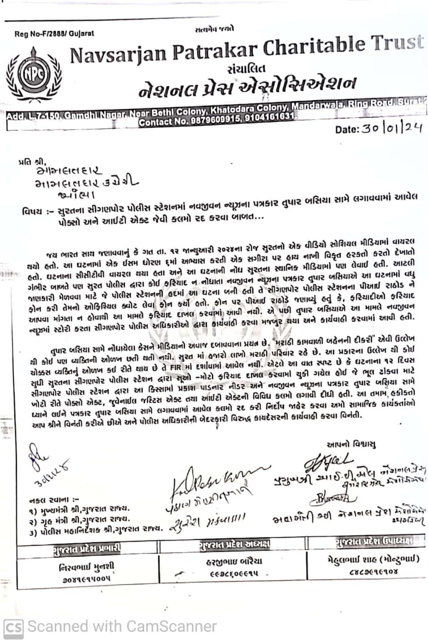 નવસર્જન પત્રકાર ચેરીટેબલ ટ્રસ્ટ સંચાલિત નેશનલ પ્રેસ એસોએશન દ્વારા સુરતના સિંગણપુર પોલીસ સ્ટેશનમાં નવજીવન ન્યૂઝના પત્રકાર તુષાર બસિયા સામે લગાવવામાં આવેલ પોકસો અને આઇટી એકટ જેવી કલમો રદ કરવા બાબત મહુવા તાલુકાના મામલતદાર સાહેબ શ્રી ને આવેદનપત્ર આપવામાં આવ્યું હતું જેમાં નવસર્જન પત્રકાર ચેરીટેબલ ટ્રસ્ટ સંચાલિત નેશનલ પ્રેસ એસોસિયેશન ના અમરેલી જિલ્લા મહામંત્રી ભાવેશભાઈ મકવાણા નેશનલ પ્રેસ એસોસિયેશન આઈ.ટી સેલ સૌરાષ્ટ્ર ઝોન પ્રમુખ હસમુખભાઈ શિયાળ. ઉપ પ્રમુખ મોસીખખાન પઠાણ ખાંભા તાલુકા મહામંત્રી સુરેશભાઈ મકવાણા તેમજ ktv ના પત્રકાર શ્રી કલ્પેશભાઈ નગદીયા સહિત તમામ પત્રકારોની ટીમ ની હાજરીમાં આવેદનપત્ર આપવામાં આવ્યુ હતું અને ભવિષ્યમાં પત્રકારો જોડે આવું કૃત્ય નહિ થાય એ ધ્યાન દોરવામાં આવ્યું.