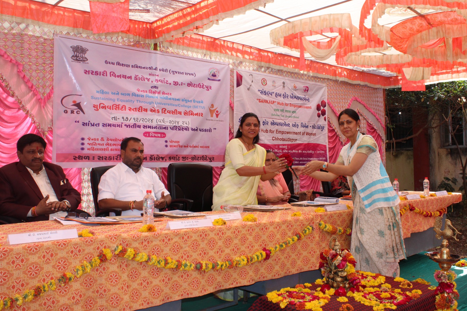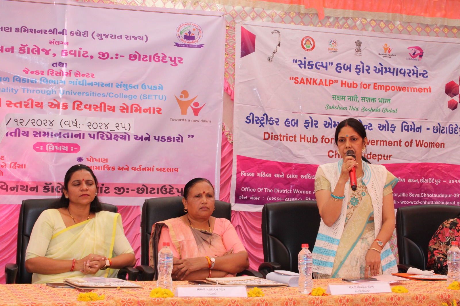 છોટાઉદેપુર જિલ્લાના કવાંટ ખાતે સરકારી વિનયન કોલેજ તથા જેન્ડર એન્ડ રિસોર્ટ સેન્ટર મહિલા અને બાળ વિકાસ વિભાગ ગાંધીનગરના સંયુક્ત ઉપક્રમે યુનિવર્સિટી સ્તરીય એક દિવાસીય સેમિનાર કાર્યક્રમ યોજાયો હતો. જેમાં છોટાઉદેપુર જિલ્લા પંચાયતના પ્રમુખ મલકાબેન પટેલ ઉપસ્થિત રહી વિદ્યાર્થીઓને માર્ગદર્શન આપ્યુ હતું.