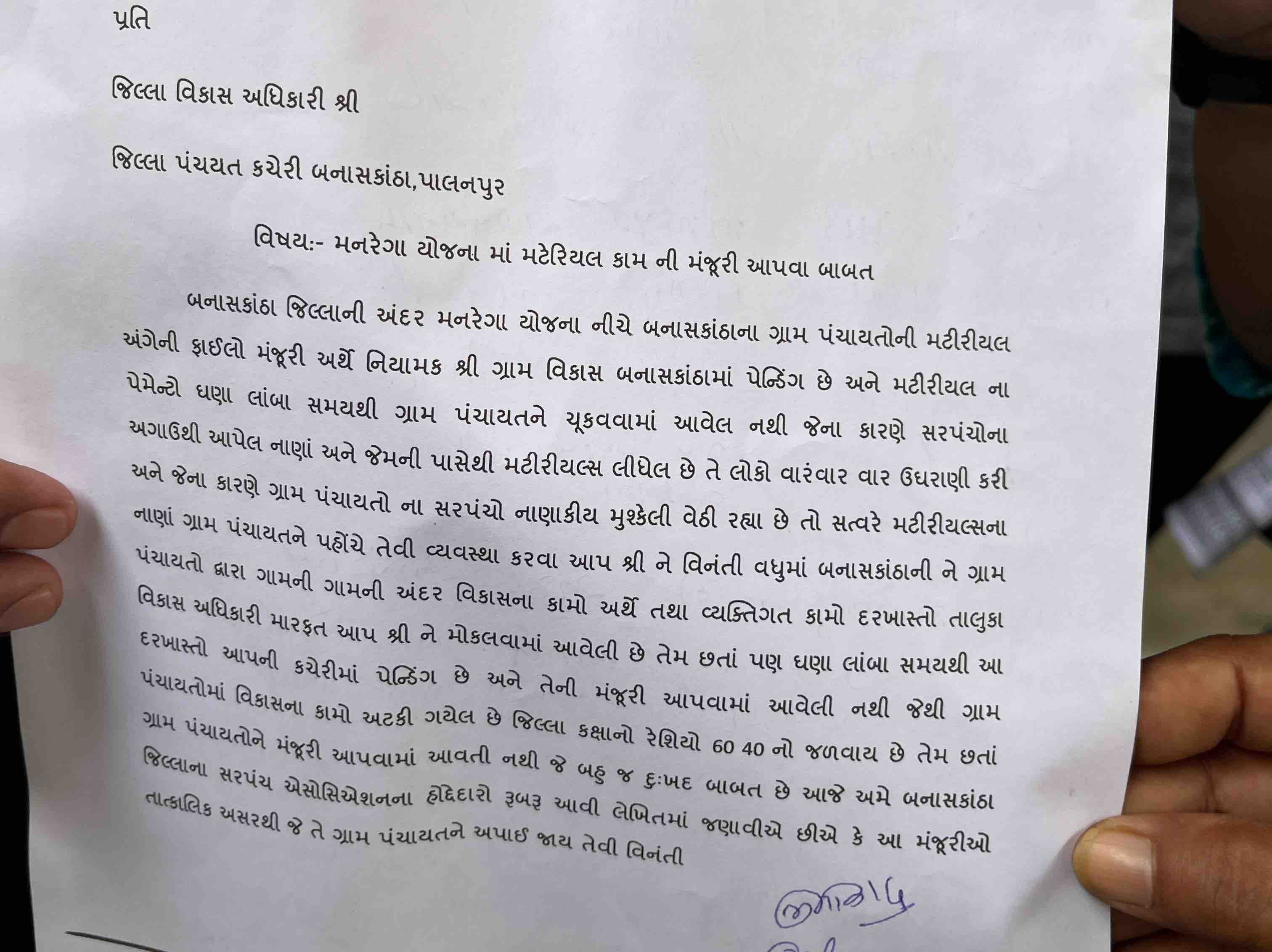 જેનાથી બે વર્ષથી ચુંટાયેલા સરપંચો કામ કરી શકતા નથી જેના કારણે લોકો પણ રોષ ઠાલવી રહ્યા છે. છેલ્લા કેટલાય સમયથી બનાસકાંઠા જિલ્લાની અંદર મનરેગા યોજના નીચે બનાસકાંઠાના ગ્રામ પંચાયતોની મટીરીયલ અંગેની ફાઈલોની મંજૂરી પેન્ડિંગ છે. જેના લીધે મટીરીયલનાં પેમેન્ટો ઘણા લાંબા સમયથી ગ્રામ પંચાયતને ચૂકવવામાં આવ્યું નથી. જેના કારણે સરપંચોએ જેમની પાસેથી મટીરીયલ્સ લીધેલ છે.