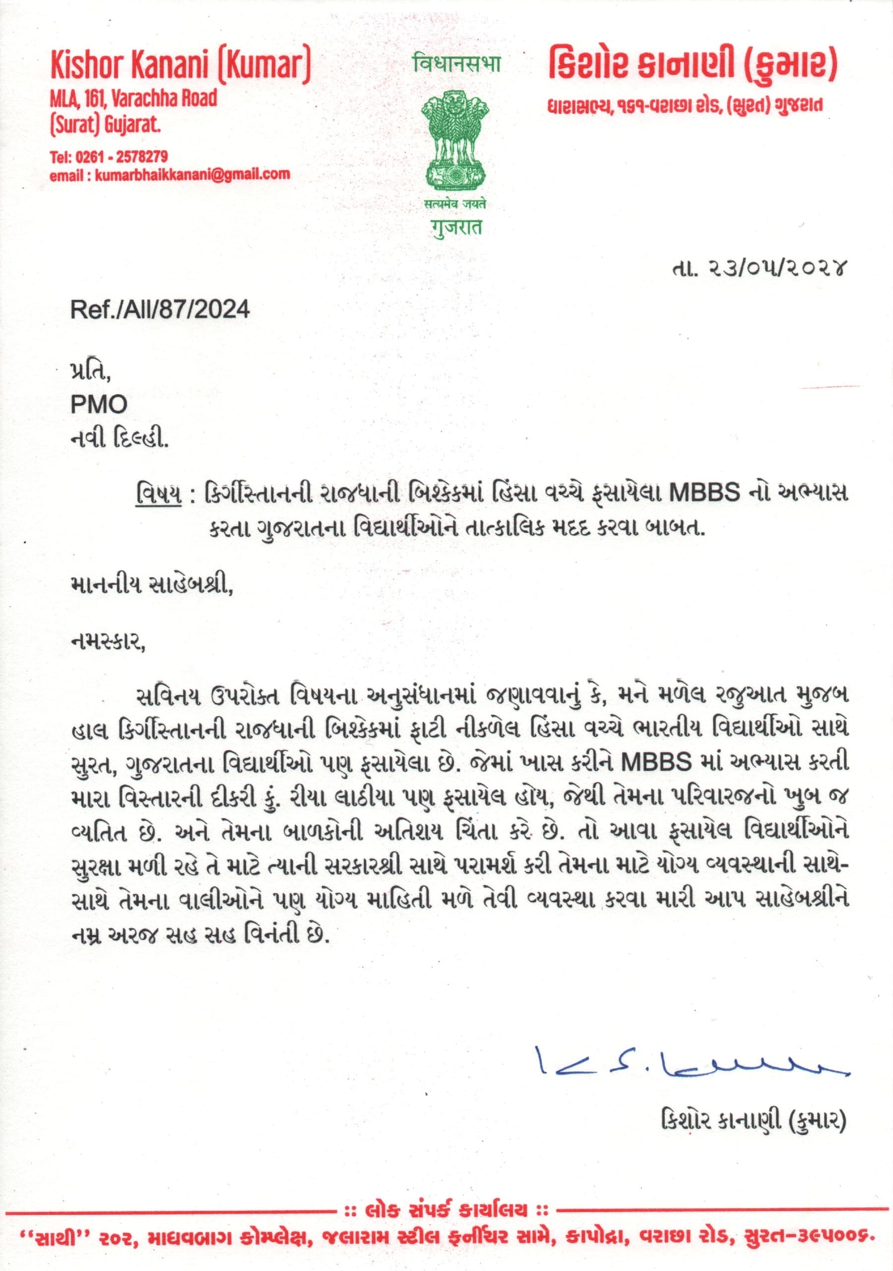 કિર્ગિસ્તાનમાં ફસાયેલા લોકોની તાત્કાલિક મદદ કરવા માગ, કહ્યું- વિદ્યાર્થીઓની સુરક્ષા સાથે વાલીઓને માહિતી મળે તેવી વ્યવસ્થા કરો