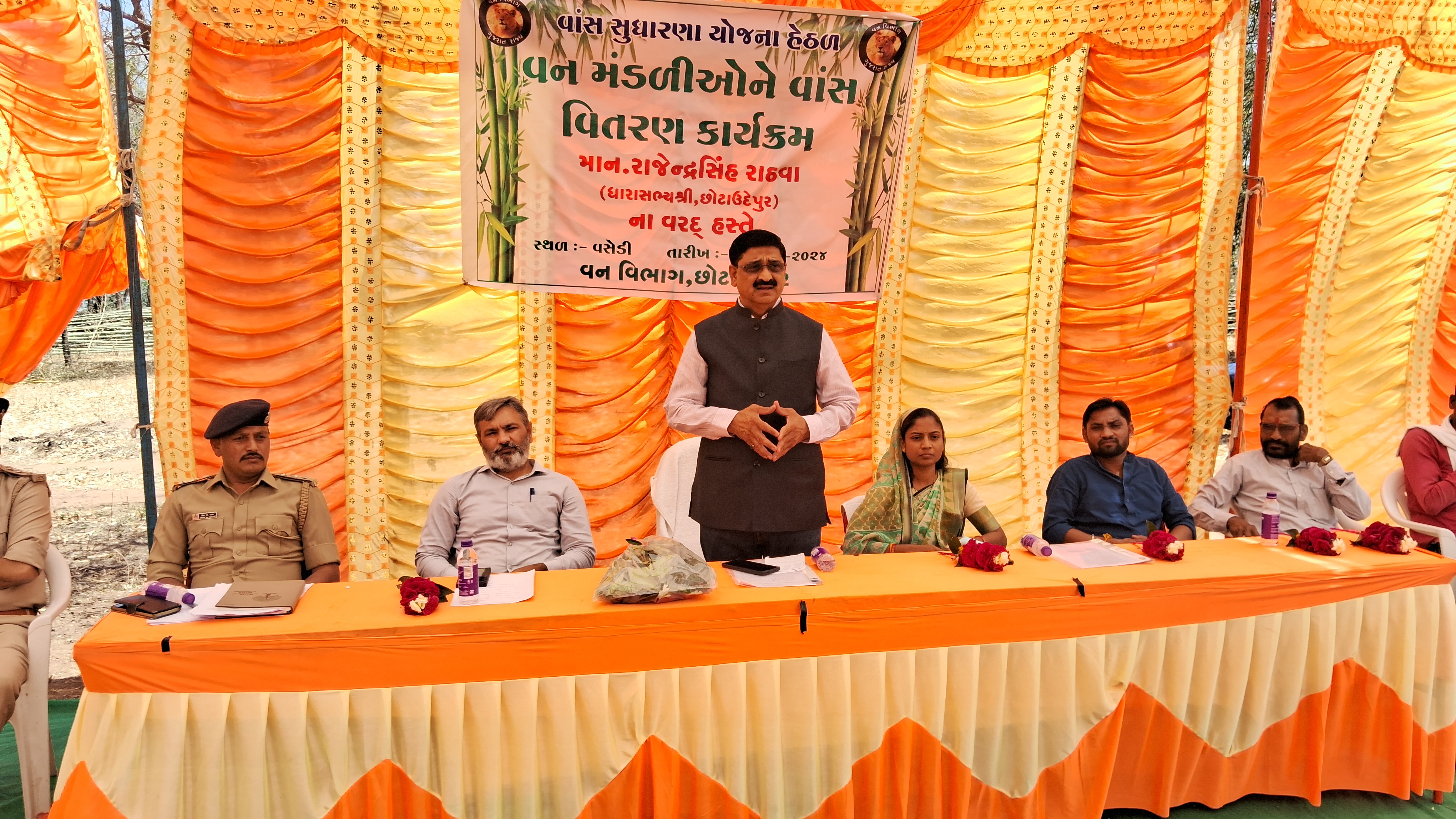 છોટાઉદેપુર વન વિભાગ દ્વારા વાસ સુધારણા યોજના હેઠળ વન મંડળીઓના વાસ વિતરણ કાર્યક્રમ અંતર્ગત છોટાઉદેપુર તાલુકાના વસેડી ખાતે છોટાઉદેપુર વિધાનસભાના ધારાસભ્ય રાજેન્દ્રસિંહ રાઠવાની ઉપસ્થિતિમાં કાર્યક્રમ યોજાયો હતો. આ કાર્યક્રમમાં ધારાસભ્યની સાથે ઉપસ્થિત છોટાઉદેપુર તાલુકા પંચાયતના પ્રમુખ કલ્પનાબેન રાઠવા, ભાજપના નેતા નવલસિંહ ભાઈ રાઠવા, ભાજપના યુવા નેતા સંગ્રામસિંહ રાઠવા, નાયબ વન સંરક્ષક વીએમ દેસાઈ, છોટાઉદેપુર રેન્જના RFO નિરંજન રાઠવા સહિત વન મંડળીઓના પ્રમુખ ઉપપ્રમુખ મંત્રીઓ ખૂબ મોટી સંખ્યામાં ઉપસ્થિત રહ્યા હતા. આ કાર્યક્રમમાં 62 લાખના ખર્ચે વન મંડળીઓને વાસ વિતરણ કરવાનો કાર્યક્રમ રાખવામાં આવ્યો હતો. આ વાસ લઈને નાની મોટી પુરક રોજગારી મળી શકે તેના માટે આ વિતરણ કરવામાં આવ્યું હતું.