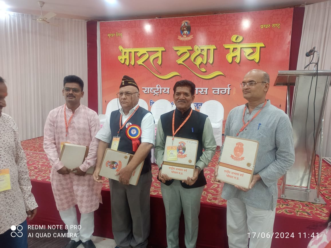 ભોપાલ મુકામે ગુજરાતી સમાજમાં તા.૧૬-૧૭ જૂન ૨૦૨૪ દિવસ- ૨ ભારત રક્ષા મંચ અભ્યાસ વર્ગની શરૂ કરવામાં આવેલ. સૌપ્રથમ મંચસ્થ મહાનુભવોના વરદ હસ્તે દીપ પ્રાગટ્ય, પ્રાર્થના ત્યારબાદ ભારત રક્ષા મંચ શૌર્ય ગીતનું સમૂહગાન ભારત માતાની જય, વંદે માતરમના જય ઘોષ સાથે કાર્યક્રમની મંગલ શરૂઆત. બાદ વર્ગ શિબિરમાં ઉપસ્થિત મહાનુભવોને ભારત રક્ષા મંચ નો લહેરી ખેસ પહેરાવી ઉષ્મા સભર સ્વાગત કરવામાં આવેલ.