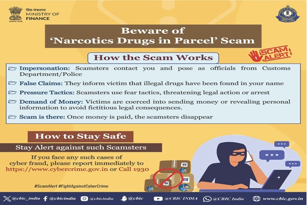 સમાચાર પત્રો, ન્યૂઝ પોર્ટલ/સોશિયલ મીડિયા પ્લેટફોર્મ્સ દ્વારા એવી ઘટનાઓ સામે આવી છે, જેમાં ભારતીય કસ્ટમ્સ ઓફિસર તરીકે ઓળખાવતા કપટી વ્યક્તિઓ દેશભરમાં તેમની મહેનતથી કમાયેલા નાણાંની જનતાને છેતરતી હોવાની વિવિધ ઘટનાઓ પ્રકાશમાં આવી છે. આ છેતરપિંડી મુખ્યત્વે ફોન કૉલ્સ અથવા એસએમએસ જેવા ડિજિટલ માધ્યમોનો ઉપયોગ કરીને કરવામાં આવે છે, અને તાત્કાલિક દંડની કાર્યવાહીના ‘કથિત’ ભય દ્વારા નાણાં કાઢવા પર ધ્યાન કેન્દ્રિત કરવામાં આવે છે. જનજાગૃતિ દ્વારા આ છેતરપિંડીઓનો સામનો કરવા માટે, સેન્ટ્રલ બોર્ડ ઓફ ઇનડાયરેક્ટ ટેક્સીસ એન્ડ કસ્ટમ્સ (સીબીઆઇસી) એક મલ્ટિ-મોડલ જાગૃતિ અભિયાન ચલાવી રહ્યું છે જેમાં નીચેનાનો સમાવેશ થાય છેઃ