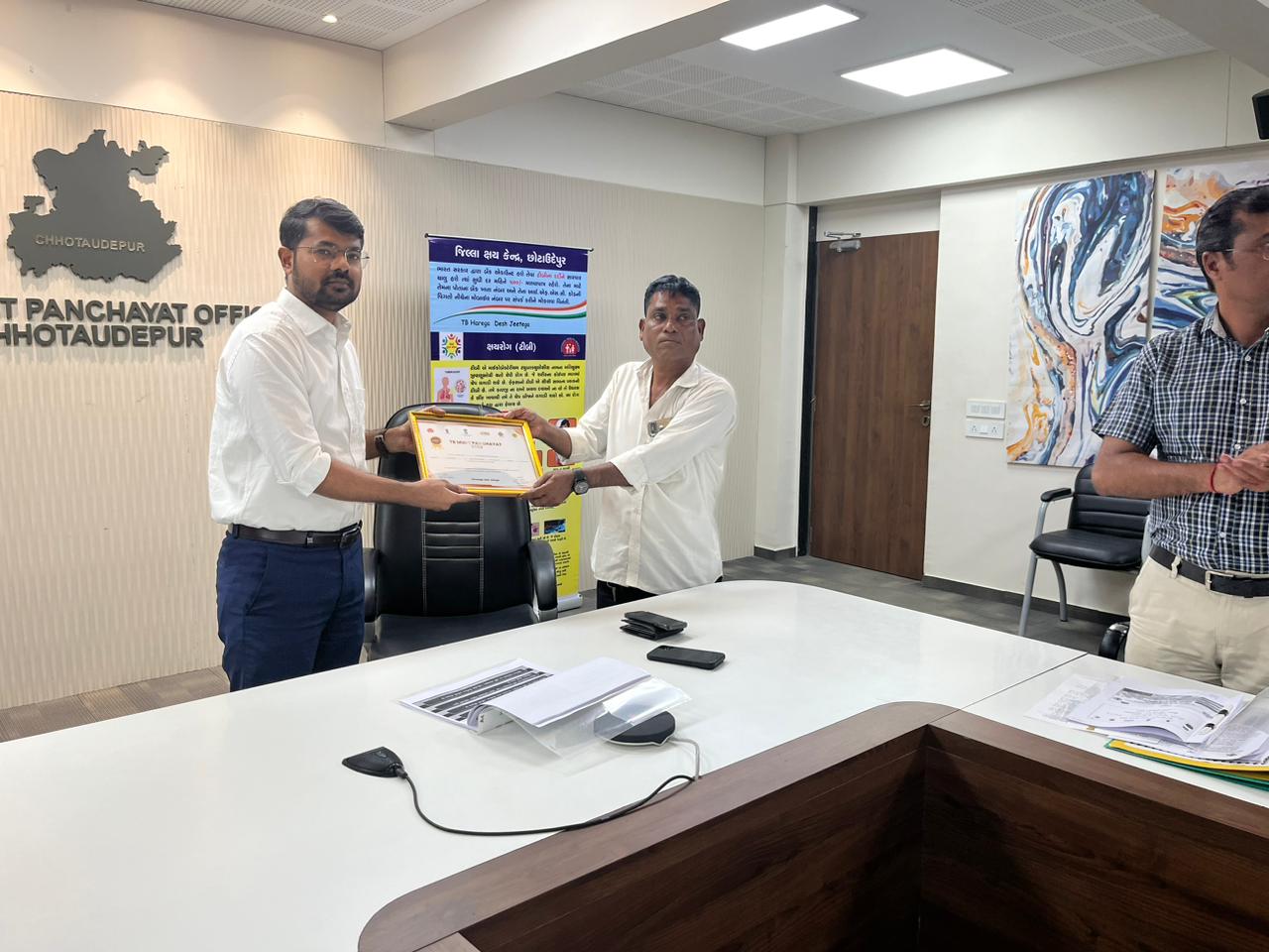 છોટાઉદેપુર જિલ્લા પંચાયતના કોન્ફરન્સ હોલ ખાતે ટીબી મુક્ત ગ્રામ પંચાયત માટે પ્રશસ્તિ પત્ર એનાયત કાર્યક્રમ યોજાયો