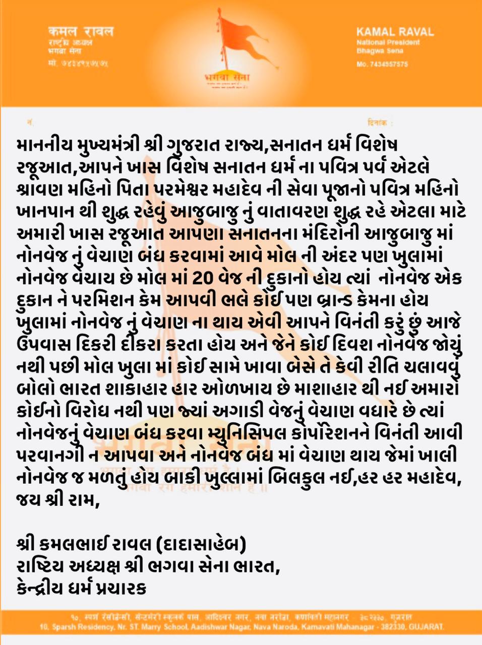 આવતીકાલથી શ્રાવણ મહિનો શરૂ થઈ રહ્યો છે .જેને લઈને હિંદુ સંગઠને મુખ્યમંત્રીને પત્ર લખીને શ્રાવણ મહિનામાં શિવાલયો અને મંદિરોની આસપાસ આવેલી નોનવેજની દુકાનો બંધ રાખવા માંગણી કરી છે.