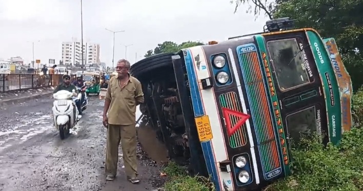 વેરાવળ-શાપર ના નેશનલ હાઇવે ના સર્વિસ રોડ પર નર્મદા ગેટ ની સામે વર્ષો જૂનું ખાડો પડી ગયેલ હોય હાઇવે આપથોરિટી ની બેદરકારી ના કારણે રીપેરીંગ કરવામાં નહીં આવતા આજે 4:30 વાગ્યાં ના અરસામાં એક ટ્રક Gj-03 BY 5901 નામનો પલ્ટી મારી જતા નારણભાઈ તુલસીભાઈ વાઘેલા નામના ડ્રાંઇવર નો આબાદ બચાવ થયો છે. જેથી આવા અનેક બનાવો વારંવાર સર્વિસ રોડ પર બનતા હોય છે.