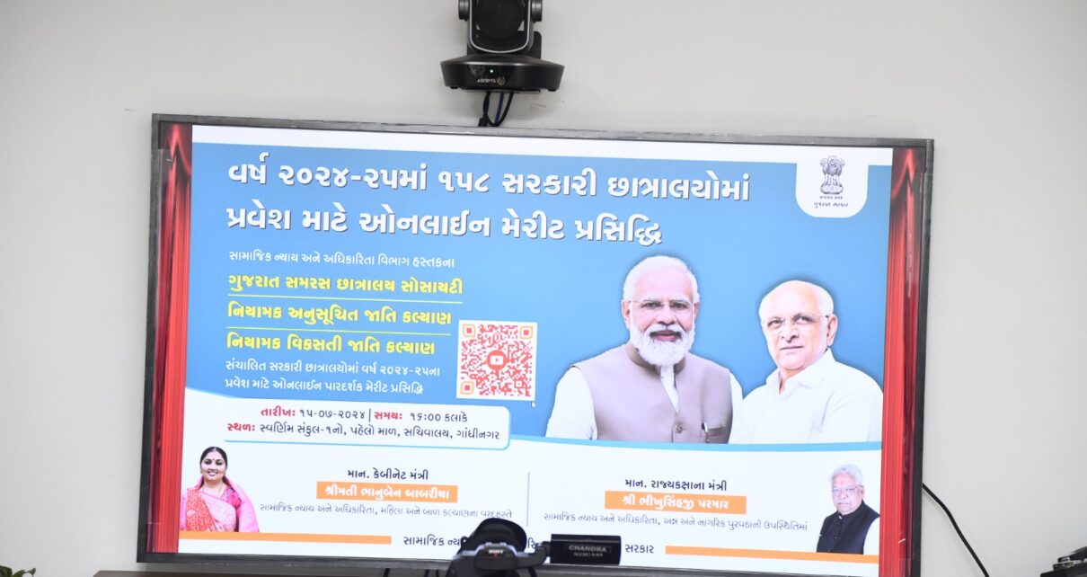 સામાજિક ન્યાય અને અધિકારીતા વિભાગ હેઠળની વિવિધ સરકારી છાત્રાલયો તેમજ સમરસ છાત્રાલયોમાં પ્રવેશ માટે ઓનલાઈન વિદ્યાર્થીઓની અરજીઓ મંગાવવામાં આવી હતી, આ અરજીઓની ચકાસણી થયા બાદ મેરીટ આધારે પ્રવેશ આપવામાં આવે છે પરંતુ ચાલુ વર્ષે વિદ્યાર્થીઓને પ્રવેશ મળી રહે તે માટે અનુસૂચિત જાતિ, અનુસૂચિત જન જાતિ, વિકસતી જાતિ અને બિન અનામત વર્ગોના વિદ્યાર્થીઓને સામાજિક ન્યાય અને અધિકારીતા વિભાગ હસ્તકની ૧૫૮ સરકારી અને સમરસ છાત્રાલયોમાં પ્રથમવાર ઓનલાઈન યુ-ટયુબ પર લાઈવ પ્રસારણ કરી મેરીટ આધારે પ્રવેશ આપવાનો સંપુર્ણ પારદર્શક ર્નિણય સામાજિક ન્યાય અને અધિકારીતા મંત્રી શ્રી ભાનુબેન બાબરીયાએ કર્યો હતો. જેનાથી વિદ્યાર્થીઓ પારદર્શક રીતે કેટેગરી વાઈઝ મેરીટ જોઈ પ્રવેશ મેળવી શકશે. આ ઓનલાઈન કાર્યક્રમમાં રાજયકક્ષાના મંત્રી શ્રી ભીખુસિંહજી પરમાર, સામાજિક ન્યાય અને અધિકારીતા, અન્ન અને નાગરિક પુરવઠા તેમજ અધિક મુખ્ય સચિવશ્રી, ખાતાના વડાશ્રીઓ અને અધિકારીશ્રીઓ હાજર રહ્યા હતા.
