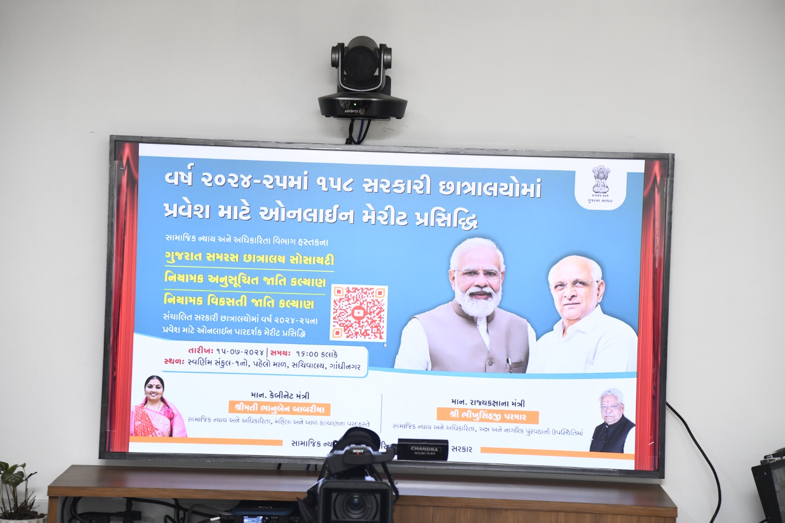 સામાજિક ન્યાય અને અધિકારીતા વિભાગ હેઠળની વિવિધ સરકારી છાત્રાલયો તેમજ સમરસ છાત્રાલયોમાં પ્રવેશ માટે ઓનલાઈન વિદ્યાર્થીઓની અરજીઓ મંગાવવામાં આવી હતી, આ અરજીઓની ચકાસણી થયા બાદ મેરીટ આધારે પ્રવેશ આપવામાં આવે છે પરંતુ ચાલુ વર્ષે વિદ્યાર્થીઓને પ્રવેશ મળી રહે તે માટે અનુસૂચિત જાતિ, અનુસૂચિત જન જાતિ, વિકસતી જાતિ અને બિન અનામત વર્ગોના વિદ્યાર્થીઓને સામાજિક ન્યાય અને અધિકારીતા વિભાગ હસ્તકની ૧૫૮ સરકારી અને સમરસ છાત્રાલયોમાં પ્રથમવાર ઓનલાઈન યુ-ટયુબ પર લાઈવ પ્રસારણ કરી મેરીટ આધારે પ્રવેશ આપવાનો સંપુર્ણ પારદર્શક ર્નિણય સામાજિક ન્યાય અને અધિકારીતા મંત્રી શ્રી ભાનુબેન બાબરીયાએ કર્યો હતો. જેનાથી વિદ્યાર્થીઓ પારદર્શક રીતે કેટેગરી વાઈઝ મેરીટ જોઈ પ્રવેશ મેળવી શકશે. આ ઓનલાઈન કાર્યક્રમમાં રાજયકક્ષાના મંત્રી શ્રી ભીખુસિંહજી પરમાર, સામાજિક ન્યાય અને અધિકારીતા, અન્ન અને નાગરિક પુરવઠા તેમજ અધિક મુખ્ય સચિવશ્રી, ખાતાના વડાશ્રીઓ અને અધિકારીશ્રીઓ હાજર રહ્યા હતા.
