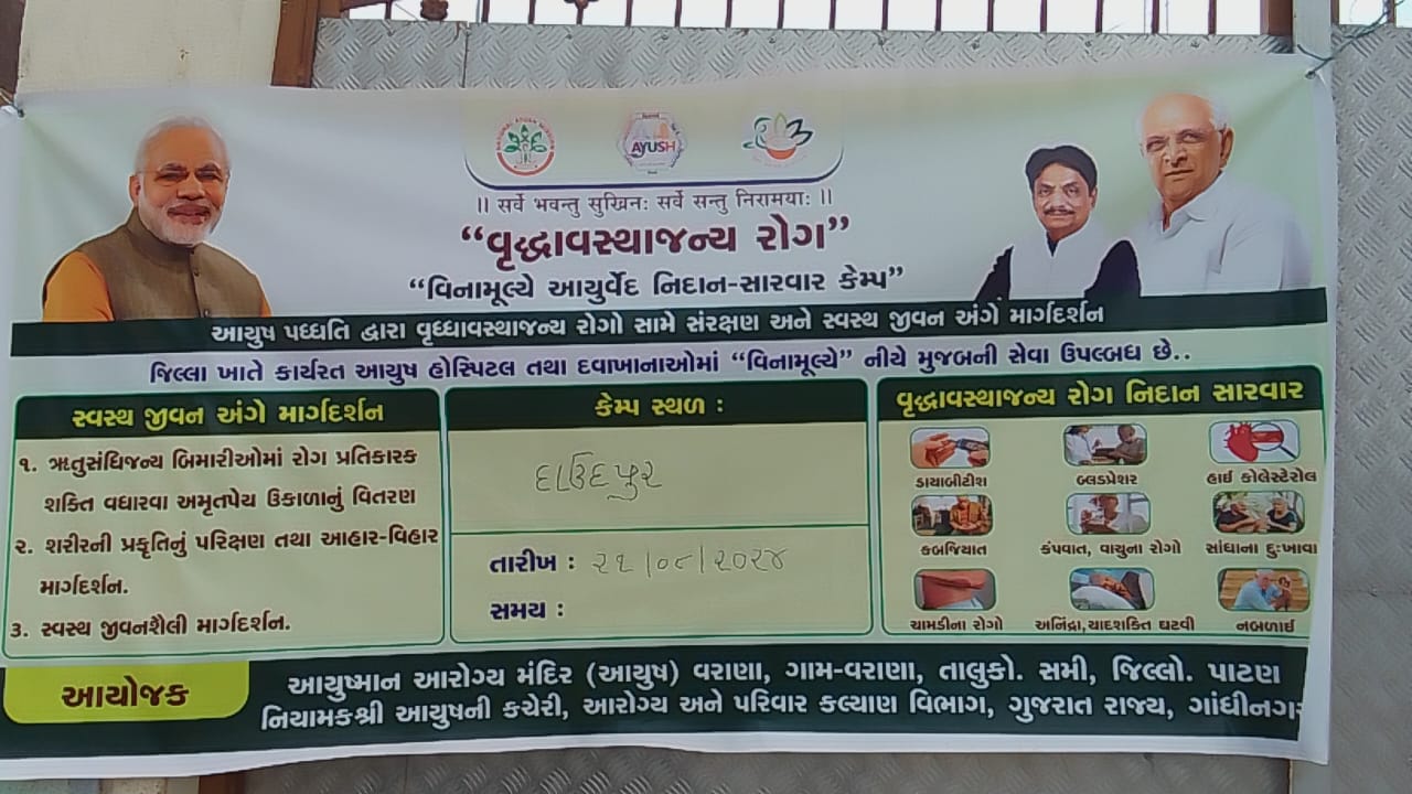 પાટણ જિલ્લાના સમી તાલુકાના દાઉદપુર ગામ ખાતે આવેલ ગ્રામ પંચાયતમાં “સિનિયર સિટીઝન ડે” નિમિતે વૃદ્ધાવસ્થા જન્ય રોગોનું સરકારી આયુર્વેદ દવાખાનું વરાણા તાલુકો સમી દ્વારા વિના મૂલ્યે નિદાન સારવાર આયુર્વેદ કેમ્પ યોજાયો હતો. તથા અમૃતપ્રેય ઉકાળા વિતરણ ઋતુજન્ય રોગ નીવારણ અર્થે ભવ્ય કેમ્પનું આયોજન કરવામાં આવ્યું હતું.કેમ્પ અંતર્ગત મોટી સંખ્યામાં ગામનાં સિનિયર સિટીઝન લોકોએ લાભ લીધો હતો.