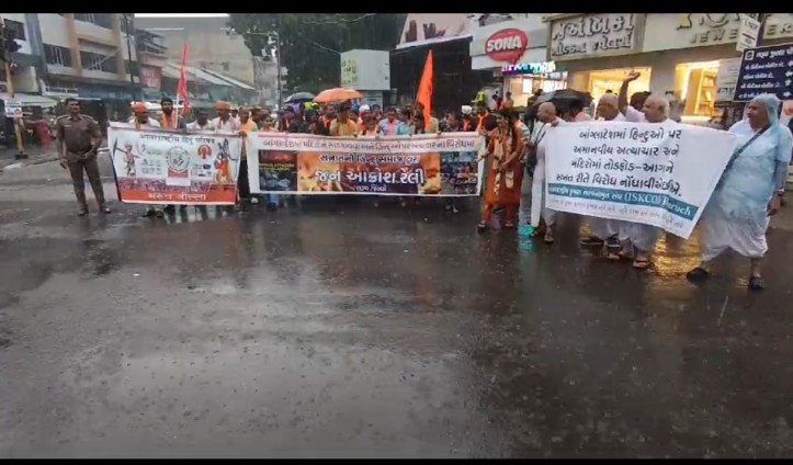 હિંદુઓ પર થતા ઘૃણાસ્પદ અત્યાચાર તેમજ હિન્દુ ધાર્મિક સ્થાનો પર થતા હુમલા અટકાવવા ભારત સરકાર તાકીદે રાજદ્વારી સંબંધો અપનાવીને પગલાં ભરે તેવી માંગ સાથે મંગળવારે વરસતા વરસાદમાં સમસ્ત સનાતની હિંદુ સમાજ દ્વારા પાંચબત્તી થી કલેકટર કચેરી સુધી રેલી કાઢીને આવેદન પત્ર આપવામાં આવ્યું હતું.