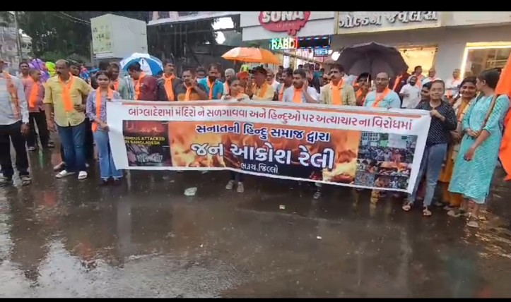 જન આક્રોશ રેલીના બેનર સાથે હિન્દુ સનાતની સમાજ દ્વારા કાઢવામાં આવેલી રેલીમાં મોટી સંખ્યામાં નાગરિકો જોડાયા હતા. બાંગ્લાદેશમાં હિન્દુ સમાજ ની તમામ પ્રકારની સલામતી માટે સત્વરે પગલાં લેવાય તેવી માંગ કરી હતી.આંતર રાષ્ટ્રીય વિશ્વ હિન્દુ પરિષદ-ભરૂચ, સમસ્ત હિન્દુ સનાતની સમાજ, આંતર રાષ્ટ્રીય ભવનામૃત સંઘ(ઇસ્કોન)-, હિન્દુ ધર્મ સેના, ભરૂચ ના વિવિધ સંગઠનના અગ્રણીઓએ પણ આ રેલીમાં ઉપસ્થિત રહી ભારત સરકારને રેલી સાથે કલેકટર ના માધ્યમથી તાકીદે પગલાં લેવાની તાકીદ કરી હતી.