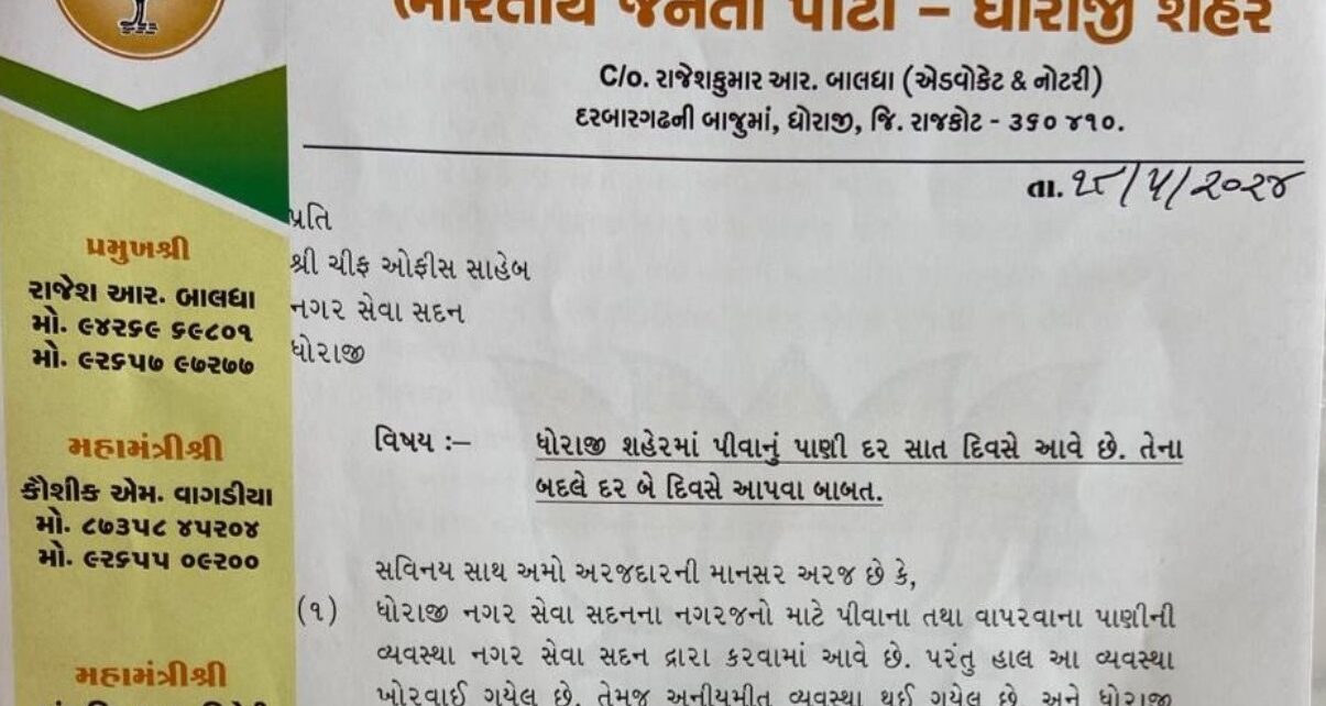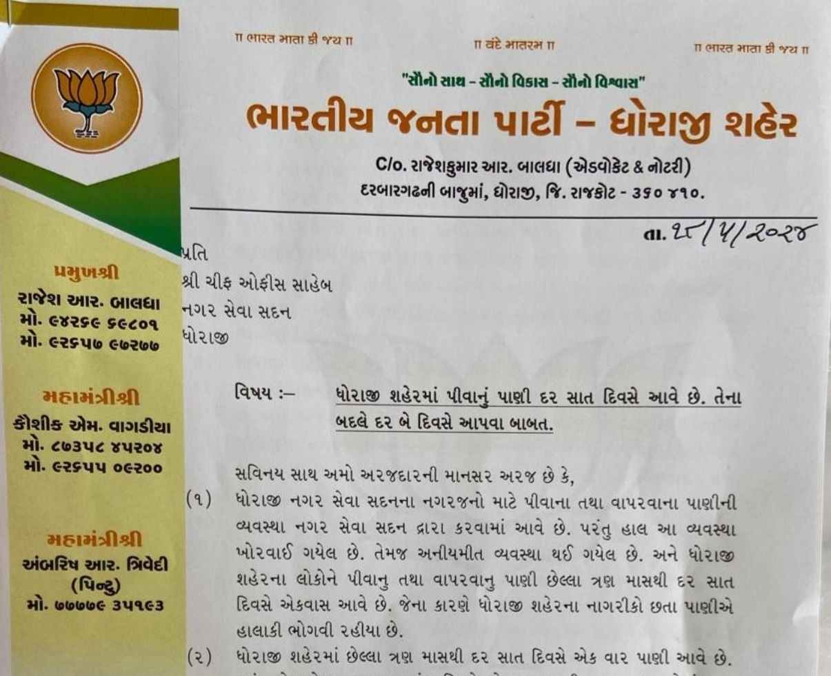 ધોરાજી નગર સેવા સદન ધોરાજીના લોકોને છેલ્લા ત્રણ માસથી સાત દિવસે એક વાર પીવાનું અને વાપરવાનું પાણી મળે છે અને તે પહેલા પણ પાંચ દિવસે એકવાર પાણી મળતુ તેમજ છેલ્લા ત્રણ માસથી સાત દિવસે એકવાર પાણી મળે છે તે પણ ફીલ્ટર વગરનું પાણી મળે છે. તેમજ અમુક વિસ્તારમાં પીવાના પાણીની લાઈન તુટી ગયેલ હોય અને તેની સાથે ગંદુ પાણી ભળતુ હોવાના કારણે લોકોના આરોગ્ય સાથે ચેડા થાય છે. તે રીપેરીંગ થતુ નથી. તેમજ અમુક વિસ્તારમાં પીવાનુ પાણી લાઈન દ્વારા મળતુ જ નથી. તેની ફરીયાદોનો નિકાલ થતો નથી. તેથી ધોરાજીના નાના-મધ્યમ અને ગરીબ લોકોને પીવાના પાણીની અનીયમીત વ્યવસ્થાના કારણે સમસ્યાથી પીડાય છે. અને નગર સેવા સદનના કર્મચારીઓ અને વહીવટ કરતા અધિકારીઓ દ્વારા પીવાના પાણી પ્રશ્ને ઉમ દાખવેલ છે. છતા પાણીએ નાપાણીયા સાબીત થયેલ છે. અને ધોરાજીના લોકો તેમની સહનસીલતા ગુમાવે અને આક્રમક મીજાજ બતાવે અને પાણી પ્રશ્ને યુધ્ધ અને આંદોલન થાય તે પહેલા દર બે દિવસે લોકોની જરૂરીયાત મુજબ સમયસર પાણી મળી રહે તે માટે યુધ્ધના ધોરણે કાર્યવાહી આપના દ્વારા કરવામાં નહી આવે તો આવનારા દિવસોમાં લોકો દ્રારા આંદોલન થશે તો તેની તમામ જવાબદારી આપના અને લાગતા વળગતા અધિકારીશ્રીઓની રહેશે. જેથી લોકોને તેની જરૂરીયાત મુજબનુ પીવાનું તથા વાપરવાનુ પાણી સમયસર મળે તે માટે તાત્કાલીક કાર્યવાહી કરવા અરજ છે.