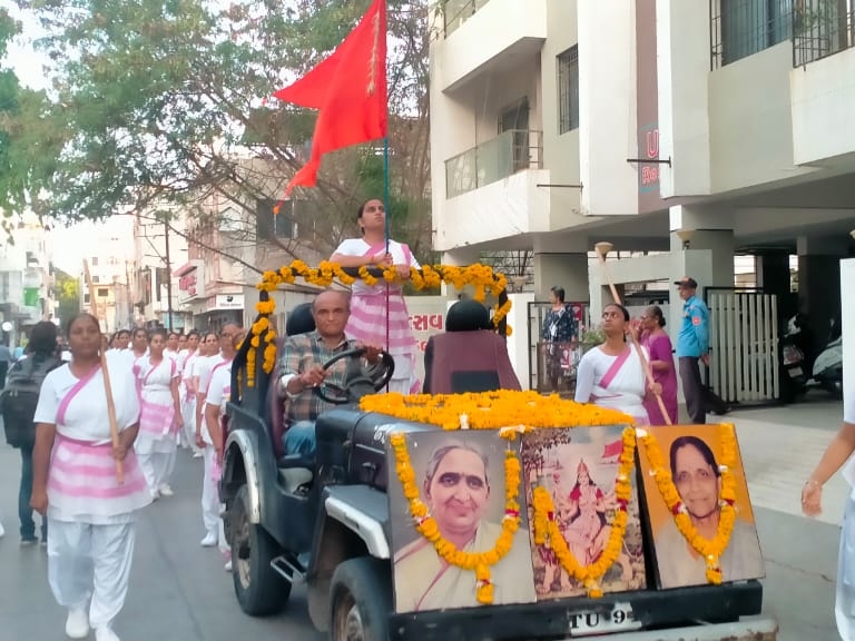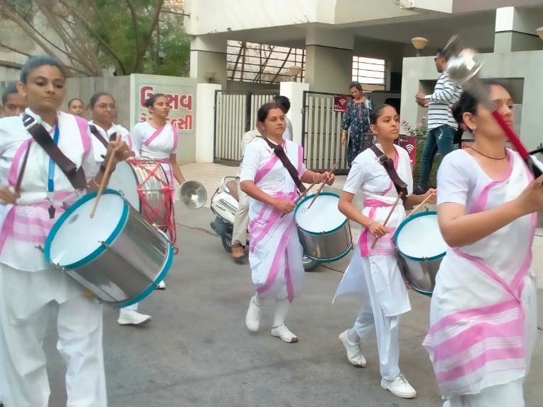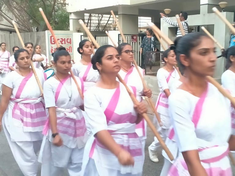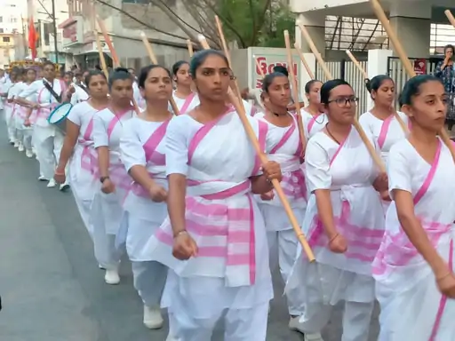 જે પથ સંચાલનના માર્ગ પર ઠેર ઠેર ભગવા ધ્વજ પર પુષ્પવૃષ્ટિ કરવામાં આવી હતી. સફેદ અને શ્યામ ગુલાબી પટાવાળી સાડીના ડ્રેસમાં સજ્જ થઈ ને 100 થી વધુ બહેનો પથ સંચલનમાં જોડાયા હતા.