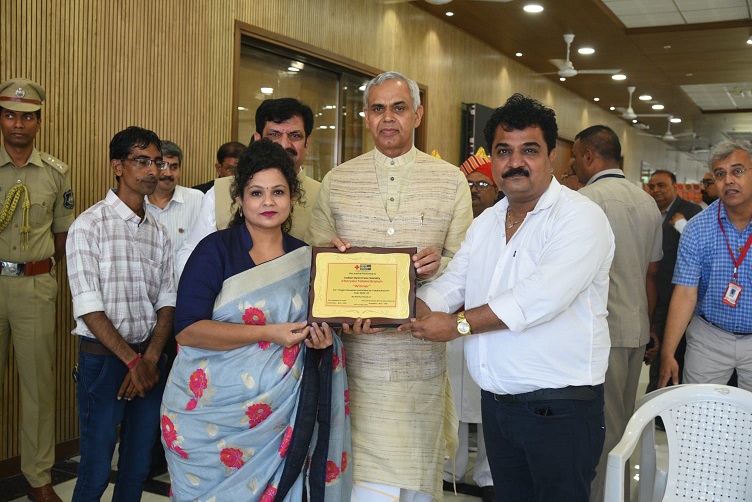 પ્રસ્તુત તસવીરમાં ઈન્ડિયન રેડક્રોસ સોસાયટીના સેક્રેટરી મેહુલભાઈ વ્યાસ તથા તેમના ધર્મપત્ની પૂજાબેન વ્યાસને ગુજરાત ગર્વનર દેવવ્રત આચાર્યજી એવોર્ડ આપી રહ્યા છે.