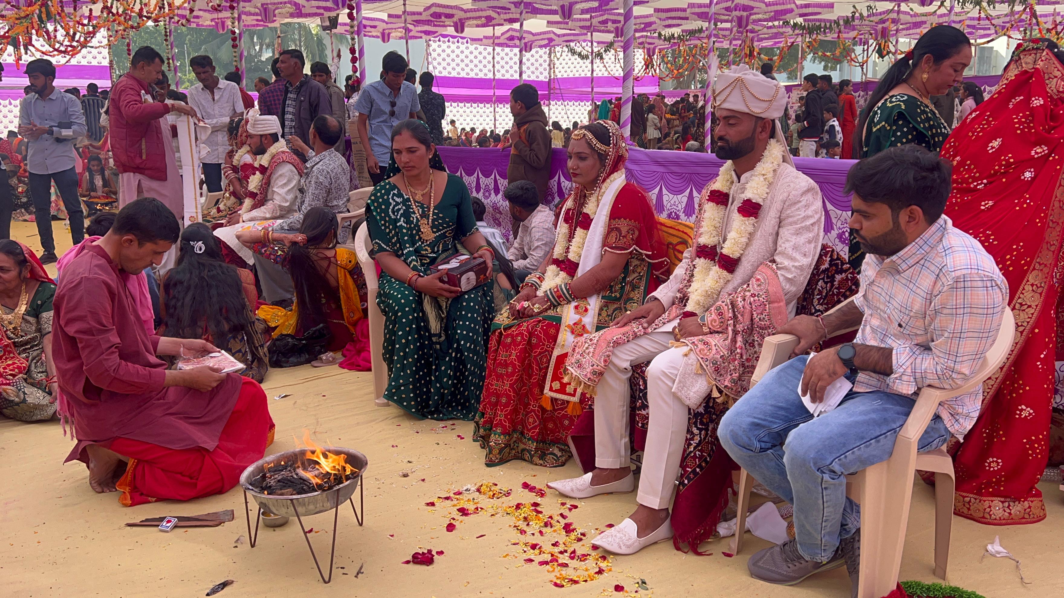સવારે આઠ વાગ્યે તમામ જાન આવી પહોચી હતી અને શાસ્ત્રોક્ત વિધિથી જાનના ઓવારણા લઇ મંડપમાં લઇ જવામાં આવી હતી. જ્યાં હસ્ત મેળાપથી માંડી સપ્તપદીના ફેરા સુધી તમામ વિધિઓ ભૂદેવો દ્વારા કરાવવામાં આવી હતી. આહીર સમાજના અગ્રણી ભાઈઓ-બહેનોએ એક એક જાન મંડપમાં જઈ નવ દંપતીઓને ગીતાજી અર્પણ કર્યા હતા.