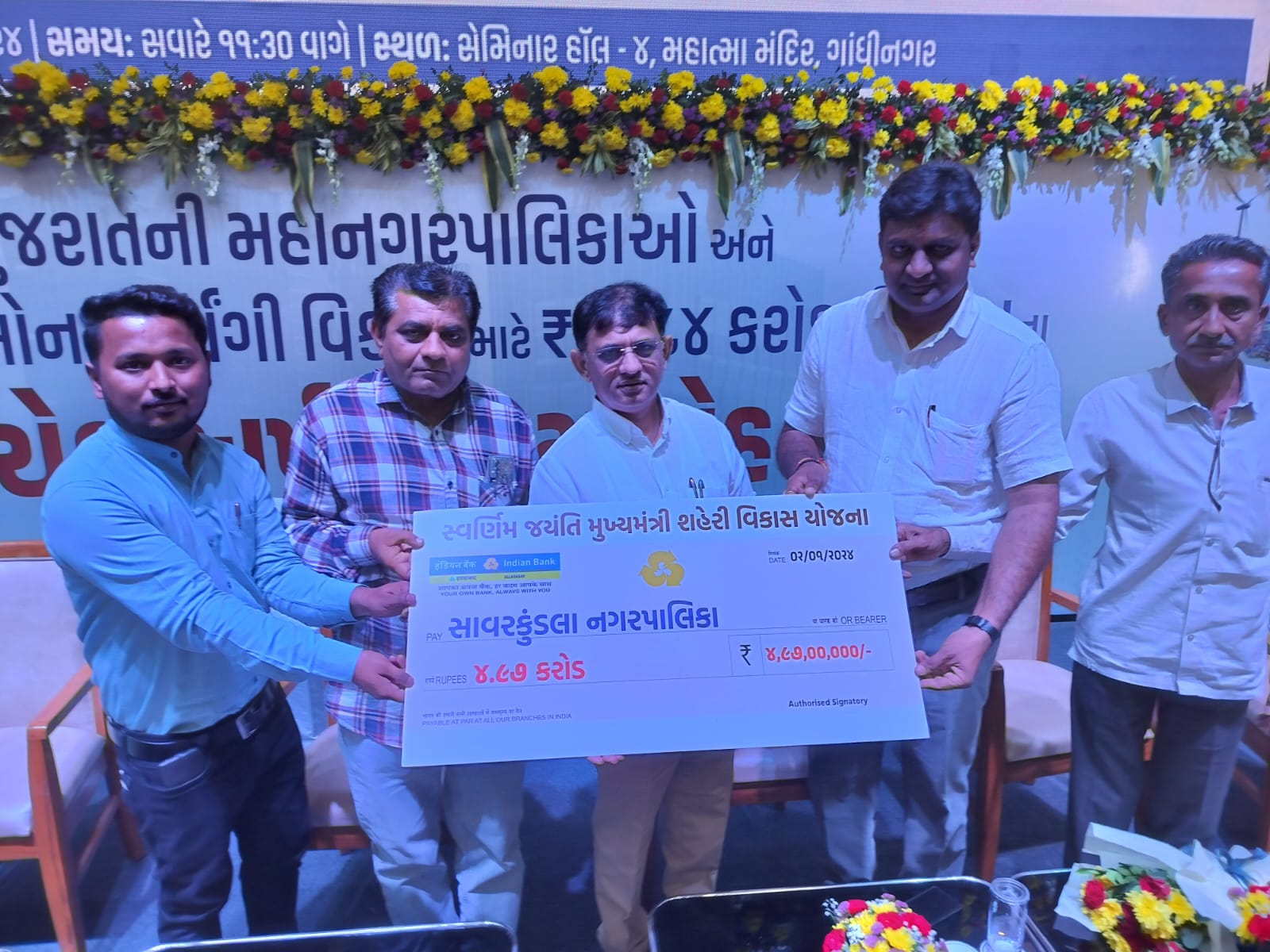 ગઈકાલ તારીખ ૨ – ૧-૨૪ના રોજ ગાંધીનગરના મહાત્મા મંદિર ખાતે રાજ્યની મહાનગરપાલિકાઓ, પાલિકાઓ અને સત્તા મંડળોને પોતપોતાના વિસ્તારના લોકોની જનસુવિધાના કાર્યો કરી શકે તે માટે કરોડો રૂપિયાના ચેક અર્પણ કરવાનો કાર્યક્રમ યોજાઈ ગયો તેમાં સાવરકુંડલા શહેરને પણ જનસુવિધાના કાર્યો માટે મુખ્યમંત્રી ભુપેન્દ્રભાઈ પટેલના હસ્તે અને સાવરકુંડલા લીલીયાના ધારાસભ્ય મહેશભાઈ કસવાળાની હાજરીમાં રૂપિયા પાંચ કરોડ જેવી માતબર રકમનો ચેક અર્પણ કરવામાં આવ્યો હતો. સાવરકુંડલા પાલીકાના હોદ્દેદારો પ્રમુખ મેહુલભાઈ ત્રિવેદી ,ઉપ-પ્રમુખ પ્રતિકભાઇ નાકરાણી, કારોબારી સમિતિના ચેરમેન અશોકભાઈ ચૌહાણ અને ચીફ ઓફિસર સાવરકુંડલાથી ચેક વિતરણ કાર્યક્રમમાં ગાંધીનગર ગયા હતા જેમણે ધારાસભ્ય મહેશભાઇ કસવાળાની હાજરીમાં ભુપેન્દ્રભાઈ પટેલના હસ્તે પાંચ કરોડ રૂપિયાનો ચેક સ્વીકાર્યો હતો. અત્રે નોંધનીય છે કે અમરેલી જિલ્લાની ૬ નગરપાલિકાઓ પૈકી રૂપિયા પાંચ કરોડ જેવી માતબર રકમ જનસુવિધાના કાર્યો માટે મેળવવામાં ધારાસભ્ય મહેશભાઈ કસવાળાની જહેમતથી એક માત્ર સાવરકુંડલા નગરપાલિકા સફળ થઈ છે જેથી સાવરકુંડલા શહેરના લોકો ધારાસભ્ય મહેશભાઈ કસવાળાને અભિનંદન સાથે આભાર માની રહ્યા છે. પાંચ કરોડ રૂપિયા જેવી માતબર રકમ પાલીકાને મળતા પાલીકા સત્તાધીશો ધારાસભ્ય મહેશભાઈ કસવાલાનાં માર્ગદર્શન નીચે શહેરમાં જનસુવિધાના કાર્યો કરવા માટે આયોજન કરી રહ્યા છે .