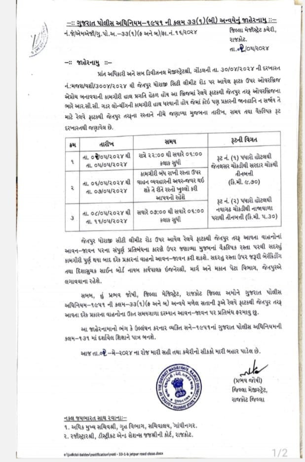જો કોઈ કારણસર આ ઓવરબ્રિજના કારણે બંધ હોય તો ફાટક પછીના અસંખ્ય સાડીઓના કારખાનાઓ, છથી સાત જેટલી સ્કૂલના વાહનો તેમજ જલારામ નગર ૧-૨-૩, નીલકંઠ સોસાયટી, દાસી જીવણપરા વગેરે દસેક જેટલાં વિસ્તારના લોકોને ધોરાજી રોડ પર આવવા માટે સાત કિમીનો ફેરો થાય તેમ છે. ઓવરબ્રિજની તાત્કાલિક મેન્ટેનન્સની કામગીરી કરવાની હોવાથી આજથી 8 મે થી 11 સુધી આ રોડ પર વાહન વ્યવહાર માટે બંધ રહેવાની જિલ્લા મેજિસ્ટ્રેટ પ્રભવ જોશી જાહેરાત કરવામાં આવી છે. અને આ માટે રેલ્વે વિભાગ દ્વારા જેતપુર પાલિકા, સિટી પોલીસ સ્ટેશન, જેતપુર એસ.ટી ડેપો તેમજ મામલતદારને જાણ કરવામાં આવી છે.