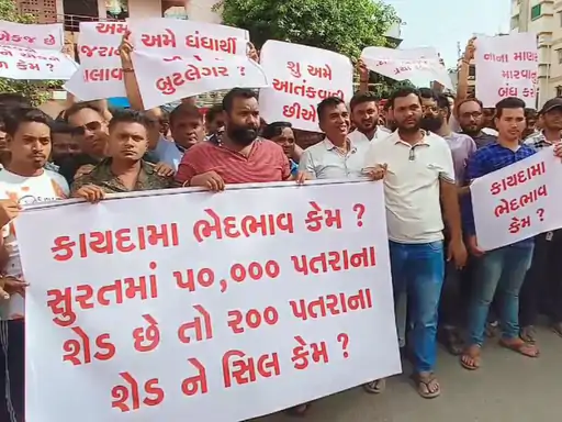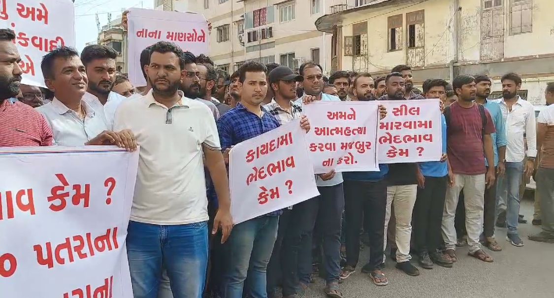 ‘અમને આત્મહત્યા કરવા મજબૂર ન કરો’ના બેનર સાથે વેપારીઓએ પતરાના શેડના સીલ ખોલી આપવાની માગ કરી