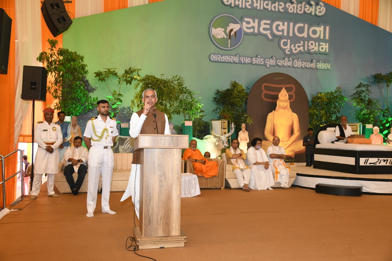 વૃક્ષોનું બે વર્ષ યોગ્ય જતન કરી આપણે આવનારી વિરાસતને બચાવી શકીશું તેવો ભાવ શ્રી દેવવ્રતજીએ વ્યક્ત કર્યો હતો. માતૃદેવો.. પિતૃદેવો ભવ.. ઉક્તિને યાદ કરી નિરાધાર અને અશક્ત વૃદ્ધ લોકોને પ્રેમભર્યો આશ્રય આપીને સદભાવના ટ્રસ્ટ સાચા અર્થમાં ધર્મનું કામ કરી રહ્યું છે અને વડીલ વંદના થકી જ ઈશ્વર પ્રાપ્તિનો માર્ગ શક્ય હોવાનું તેઓએ વંદન સાથે કહ્યું હતું. આ તકે તેમણે પર્યાવરણ બચાવ અને વડીલોની સેવા સુશ્રુષા અર્થે સેવારત સદ્દભાવના વૃદ્ધાશ્રમના પ્રણેતા શ્રી વિજયભાઈ ડોબરિયાની કામગીરીની સરાહના કરી લોકોને તેમાં સહભાગી બનવા આહવાન કર્યું હતું.