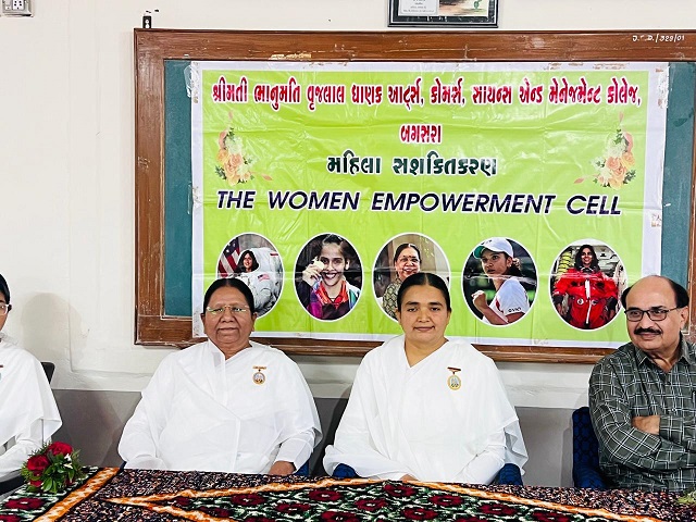 ડૉ.મધુબેને બંને બ્રહ્માકુમારી દીદીઓનો તેમજ સંસ્થાનો પરિચય આપ્યો હતો. આ કાર્યક્રમમાં મુખ્ય વક્તા તરીકે બ્રહ્માકુમારીઝ સેવાકેન્દ્ર અમરેલીનાં મુખ્ય સંચાલિકા બ્ર.કુ.ગીતાબેને “વર્તમાન સમયમાં વિદ્યાર્થિનીઓમાં મૂલ્યનિષ્ઠ શિક્ષણની જરૂરિયાત” વિષય પર મનનીય વક્તવ્ય આપ્યું હતું. તેમણે આ સમયે દીકરીઓની ભૂમિકા ખૂબ જ મહત્ત્વની બની જાય છે, તે માટે માનસિક તેમજ શારીરિક સશક્તિકરણ પર ભાર મૂક્યો હતો.