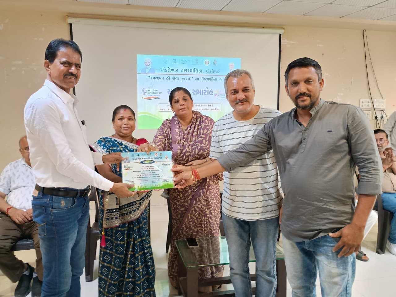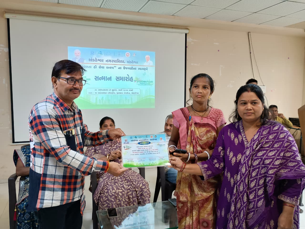 ભરૂચ – ગુરુવાર – અંકલેશ્વર નગર પાલિકા દ્વારા શારદા ભવન ટાઉન હોલ ખાતે ગાંધીજયંતી નિમિત્તે સ્વચ્છતા સેવા અંતર્ગત નગર પાલિકાના પ્રમુખ લલીતાબેન રાજપુરોહિતના અધ્યક્ષસ્થાને સ્વસ્થ ભારત દિવસની ઉજવ કરવામાં આવી હતી. જેમાં ત્રણ વોર્ડમાં શ્રેષ્ઠ સફાઈ બદલ સુપરવાઈઝર અને સફાઈ અભિયાનમાં યોગદાન આપ શૈક્ષણિક અને સામાજિક સંસ્થાઓ નું સન્માન કરવામાં આવ્યું હતું.