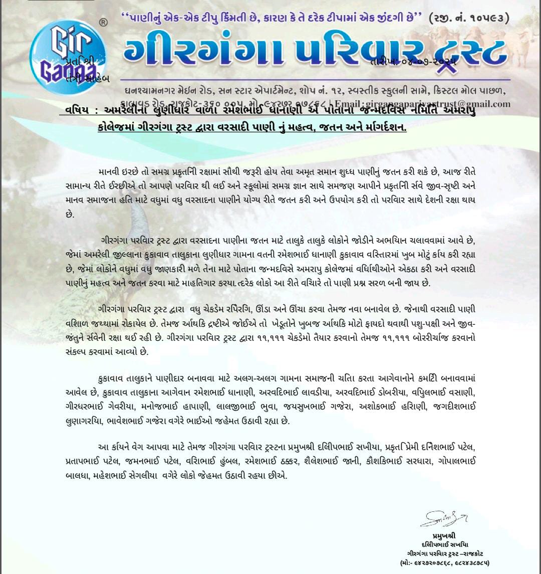 ગીરગંગા પરરવાર ટ્રસ્ટ દ્વારા વરસાદના પાણીના જતન માટે તાલુકે તાલુકે લોકોને જોડીને અભયાન ચલાવવામાં આવે છે. જેમાં અમરેલી જીલ્લાના કુકાવાવ તાલુકાના લુણીધાર ગામના વતની રમેશભાઈ ધાનાણી કુકાવાવ વસ્તિારમાં ખુબ મોટું કપિ કરી રહ્યા છે, જેમાં લોકોને વધુમાં વધુ જાણકારી મળે તેના માટે પોતાના જન્મદવિસે અમરાપુ કોલેજમાં વર્ધાથીઓને એકઠા કરી અને વરસાદી પાણીનું મહત્વ અને જતન કરવા માટે માહતિગાર કર્યાા દરેક લોકો આ રીતે વિચારે તો પાણી પ્રશ્ન સરળ બની જાય છે.