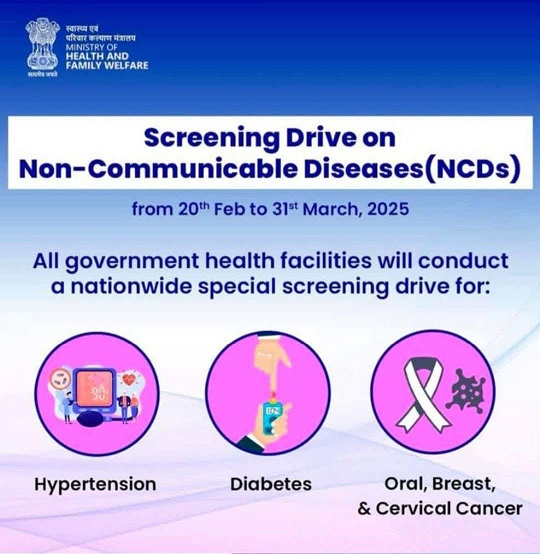 એન.પી-એન.સી.ડી. પ્રોગ્રામ અંતર્ગત બિન-ચેપી રોગોના સ્ક્રીનિંગ, નિદાન અને સારવાર માટે ખાસ અભિયાન શરૂ કરવામાં આવશે, જેનો લાભ દરેક ૩૦ + ઉંમરના નાગરિકો લઈ શકશે.
