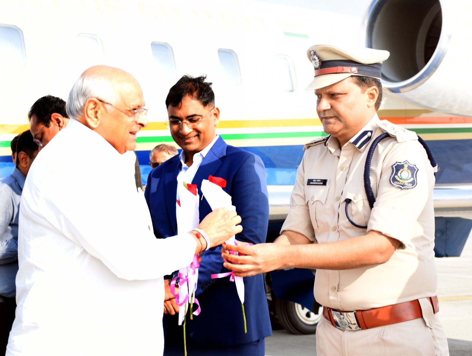 રાજકોટ ઇન્ટરનેશનલ એરપોર્ટ ખાતે મુખ્યમંત્રી ભુપેન્દ્ર પટેલનું ઉષ્માભર્યું સ્વાગત કરાયું.