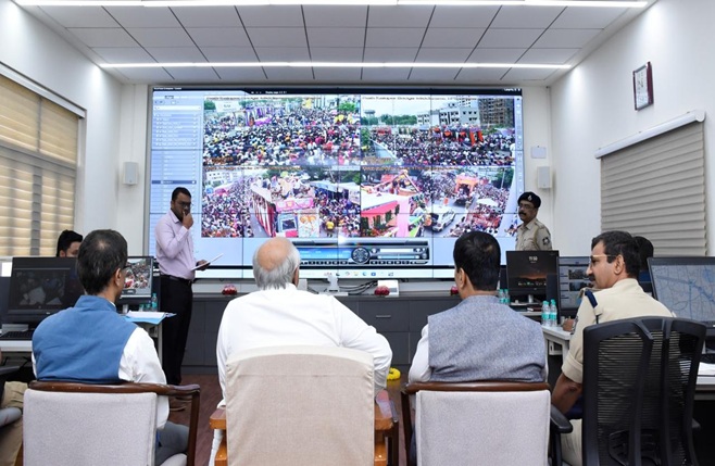 મુખ્યમંત્રી શ્રી ભૂપેન્દ્ર પટેલે અમદાવાદની ૧૪૮મી જગન્નાથ રથયાત્રાના અમદાવાદ શહેરમાં ભ્રમણ તેમજ રથયાત્રાના સંચાલનનું રિયલ ટાઈમ મોનિટરીંગ મુખ્યમંત્રી નિવાસસ્થાનના સી.એમ. ડેશ બોર્ડની વિડિયો વોલ પર જીવંત પ્રસારણ નિહાળીને કર્યું હતું.