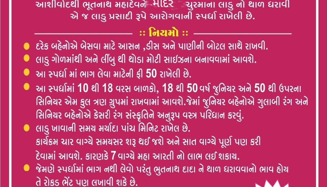 *ભુતનાથ મંદિરના મહંત પૂજ્ય શ્રી મહેશગીરી બાપુના આશીર્વાદ સાથે ગયા વર્ષની ભવ્ય ધાર્મિક ઉજવણીને ધ્યાનમાં રાખીને ફરી આ વર્ષે પણ ચુરમાના લાડુ ખાવાની સ્પર્ધા રાખેલી છે.*
