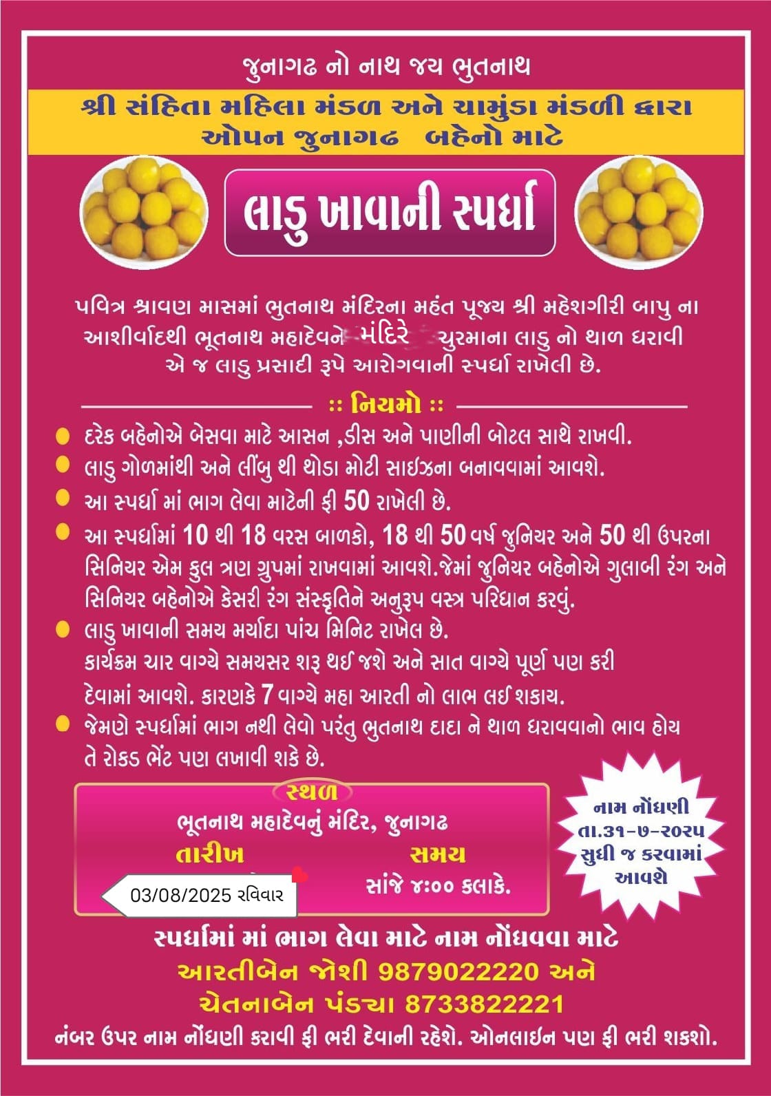 🏃🏽♀️👱🏻♀️👧🏻👩🏻🦳👵🏼 *તો ચાલો બહેનો,,, તમારું નામ નોંધણી કરાવી ફક્ત 51 રૂપિયામાં ભગવાનને થાળ પણ ધરાવો અને લાડુ ખાવાની સ્પર્ધાનો આનંદ પણ માણો.*