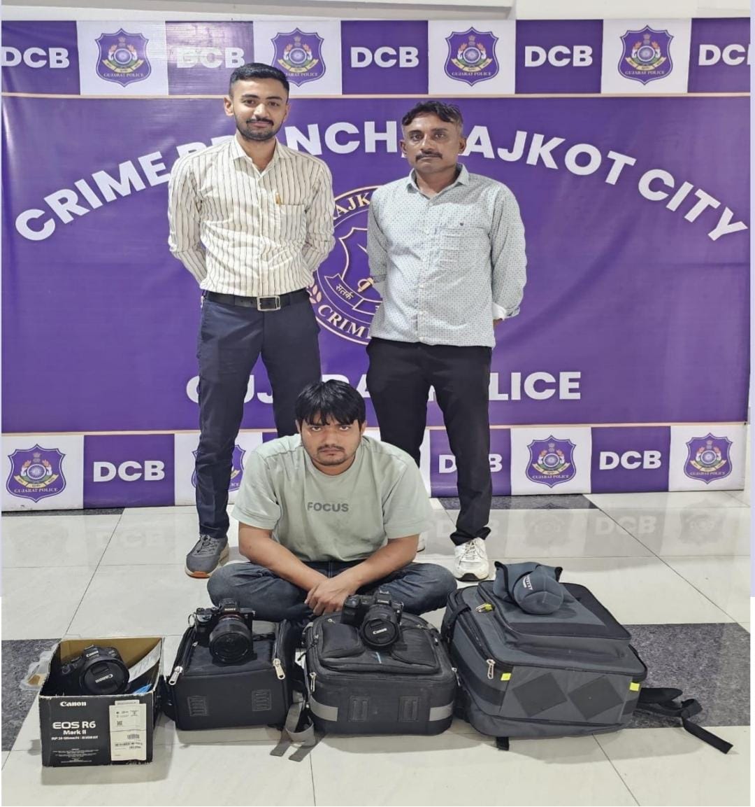 રાજકોટ શહેર તા.૨૬/૭/૨૦૨૫ ના રોજ રાજકોટ શહેરમાં પ્રોફેશનલ કેમેરાઓ ભાડે લઇ, પરત ન આપી ફરીયાદીઓ સાથે વિશ્વાતઘાત કરી, આરોપી નાસતો-ફરતો હોય, તે આરોપીને શોધી કાઢવા સારૂ રાજકોટ શહેર પોલીસ કમિશનર બ્રજેશકુમાર ઝા તથા અધિક પોલીસ કમિશનર મહેન્દ્ર બગરીયા દ્વારા ગુન્હાના કામે આરોપીને શોધી ગુન્હો ડીટેકટ કરવા જરૂરી સુચના કરેલ હોય જે સુચના અન્વયે P.I એમ.આર.ગોડલીયા તથા એમ.એલ.ડામોર, તથા સી.એચ.જાદવ નાઓ સતત પ્રયત્નશીલ હોય અને ટીમના માણસોને જરૂરી સુચના તથા માર્ગદર્શન આપેલ હોય. ઉપરોકત ગુન્હાની ગંભીરતાને ધ્યાને લઇ નાયબ પોલીસ કમિશનર (ક્રાઇમ) ડો.પાર્થરાજસિંહ ગોહિલ ના સુપરવિઝન હેઠળ અને મદદનીશ પોલીસ કમિશનર (કાઇમ) ભરત.બી.બસીયા ના માર્ગદર્શન હેઠળ DCB પોલીસ સ્ટેશનના એમ.આર.ગોંડલીયા તથા એમ.એલ.ડામોર, સી.એચ.જાદવ નાઓના નેતૃત્વ હેઠળ એ.એન.પરમાર નાઓ ની ટીમના માણસો જેમાં મોહિલ રાજસિંહ ગોહિલ, પ્રશાંતભાઈ ચુડાસમાં નાઓને ખાનગી રાહે હકિકત તેમજ ટેકનીકલ સોર્સ તેમજ હ્યુમન સોર્સ થકી રાજકોટ શહેર વિસ્તારમાં પેટ્રોલીંગમાં ફરતા હોય તે દરમ્યાન આ કામે આરોપીને પકડી તેના વિરૂધ્ધ કાયદેસરની કાર્યવાહી કરવામાં આવેલ છે. હાર્દિકભાઇ વિનોદભાઇ ટાંક જાતે-પ્રજાપતિ કુંભાર ઉ.૩૨ રહે.નાગેશ્વર જૈન મંદિર પાસે પટેલ બિલ્ડીંગ બીજા માળે રૂમનં.-૨૦૨ રાજકોટ. (1) સોની એમ-૩ મોડલના કેમેરા નંગ-૨ જે એક કેમેરાની કિ.રૂા.૨,૦૦,૦૦૦ એમ કુલ બે કેમેરાની કિ.રૂા.૪,૦૦,૦૦૦ (2) કેનેન આર.૬ મોડલનો નંગ-૧ કિ.રૂા.૩,૦૦,૦૦૦ (3) કેનેન આર કંપનીનો મોડલનો નંગ-૧ કિ.રૂા.૧,૪૦,૦૦૦ કુલ મુદ્દામાલ-૪ કેમેરા કિ.૮,૪૦,૦૦૦ રાજકોટ શહેર પ્રધ્યુમનગર પો.સ્ટેશન ભારતીય ન્યાય સંહિતા ૨૦૨૩ ની કલમ-૩૧૬(૨) મુજબ ગુનો દાખલ કરેલ હોય.