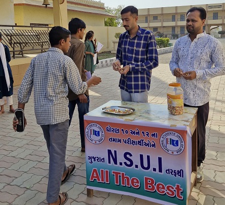 એનએસયુઆઈના કેતન ખુમાણ સમેત તેની ટીમ દ્વારા પરીક્ષાર્થીઓને મો મીઠા કરાવી પરીક્ષામાં સફળતા માટે શુભેચ્છાઓ પાઠવવામાં આવી.