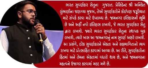 ભારત સુવર્ણકાર સેતુના ગુજરાત પ્રેસિડેન્ટ શ્રી અનિકેત લુંભાણીના જણાવ્યા મુજબ, તેઓ સુવર્ણકારોને કોઈપણ જરૂરિયાત માટે સંપર્ક કરવા માટે ઉપલબ્ધ છે. જામનગર ઇતિહાસની ભૂમિ છે અને અહીં નવો ઇતિહાસ લખાશે, જે ભારત સુવર્ણકાર સેતુ દ્વારા લખાશે. જ્યારે ભારત સુવર્ણકાર સેતુના સ્થાપક બુક લખાશે, ત્યારે ખાસ આ જામનગરનું નામ સુવર્ણ અક્ષરે લખાશે.