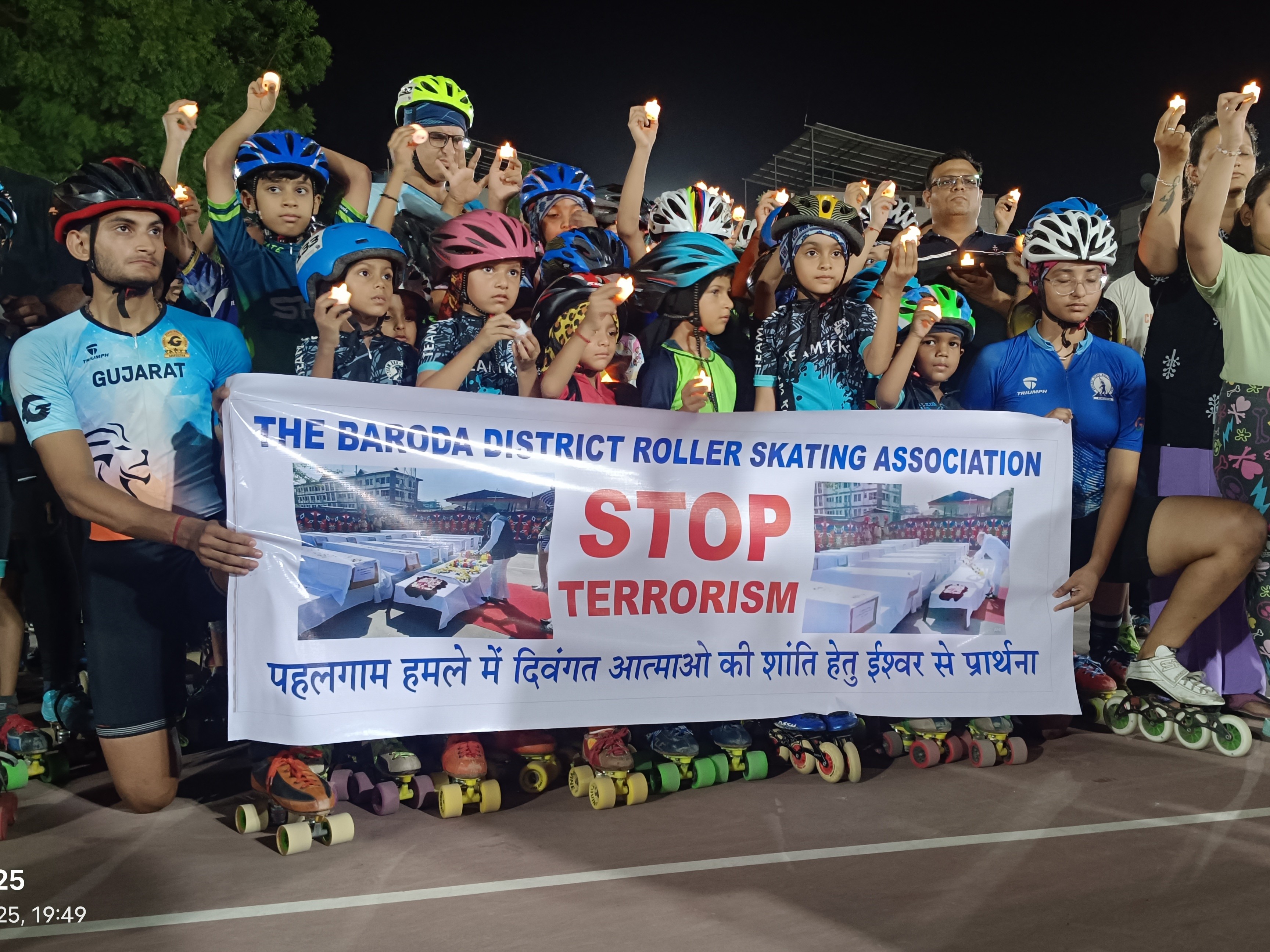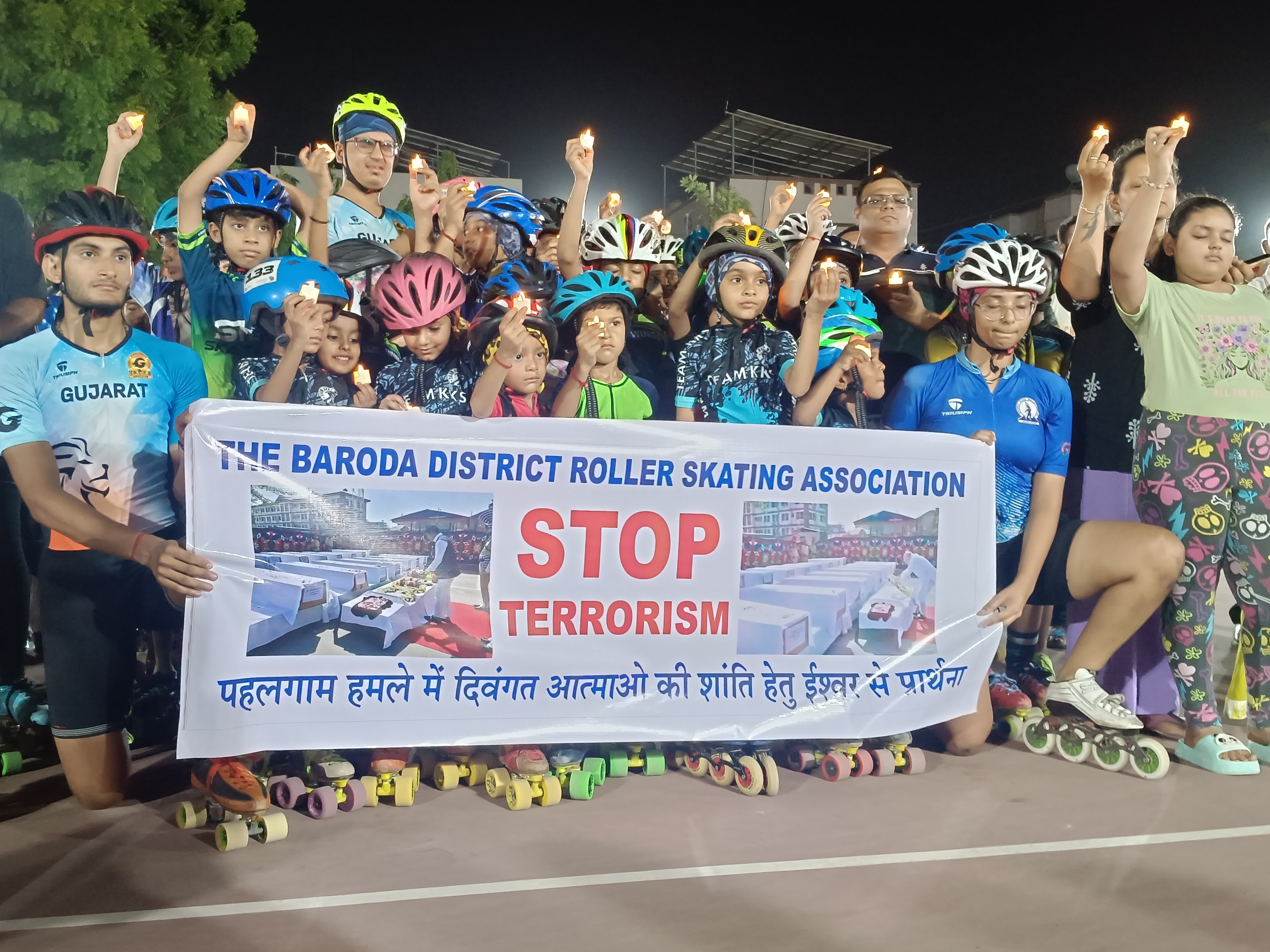 વડોદરાના કારેલીબાગ સ્થિત ઉન્નતિ સ્કેટિંગ રિંક ખાતે પહેલગામ આતંકી હુમલામાં શહીદ થયેલા લોકોને શ્રદ્ધાંજલિ આપવાનો વિશેષ કાર્યક્રમ યોજાયો. ધ બરોડા ડિસ્ટ્રિક્ટ રોલર સ્કેટિંગ એસોસિએશન દ્વારા આયોજિત આ કાર્યક્રમમાં 100થી વધુ સ્કેટર્સ અને તેમના વાલીઓએ ભાગ લીધો.