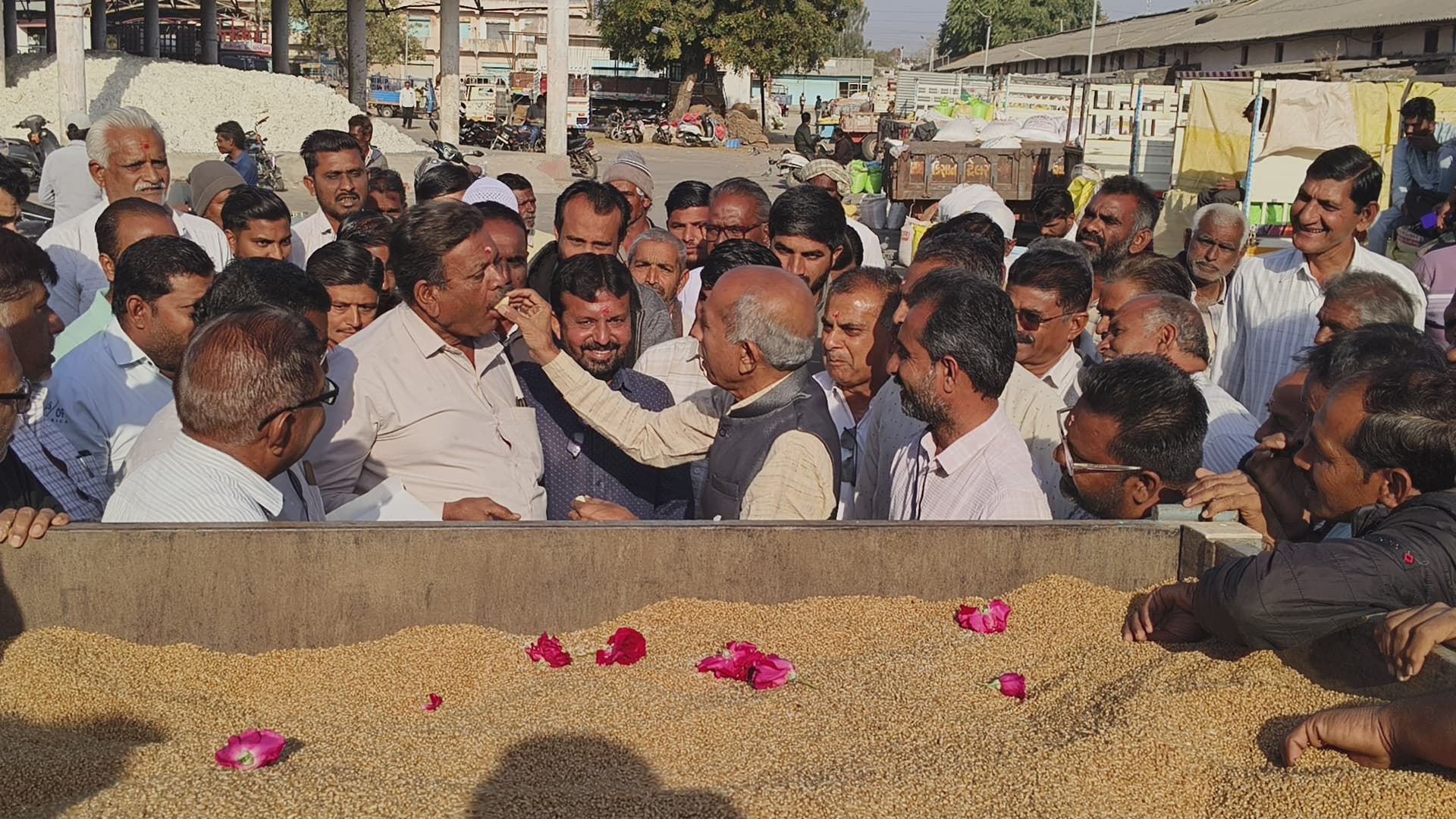 ગાધકડા ગામના ખેડુત ભરતભાઇ બાલુભાઇ સાવલીયાએ મે.વૃજલાલ પોપટલાલ એન્ડ કું.ના કમીશનમાં વેચવા માટે આવેલ. સિઝનના નવા ઘઉંની આવકના આજરોજ શ્રીગણેશ થયેલ હોય, જેનું ચેરમેનશ્રી દિપકભાઇ માલાણીના વરદ હસ્તે વિઘિસર પુજન કરી શ્રીફળ વધેરીને ખેડુતો તથા વેપારીશ્રીઓનું મોં મીઠુ કરાવીને હરરાજીની શુભ શરૂઆત કરવામાં આવી અને ઘઉં ખરીદનાર વેપારીશ્રીઓ તેમજ યાર્ડના સ્ટાફગણ અને ડીરેકટરશ્રીઓની ઉપસ્થિતીમાં ખરીદનાર વેપારીઓમાં મુહુર્તના ઘઉં ખરીદવા માટે બોલીઓ બોલવામાં આવતા વેપારી પેઢી શ્રી શાંતિલાલ સોમજીભાઇ અંબાણી દ્વારા રૂા.૯૦૨/- ની ઉંચી બોલી બોલીને ઘઉંની ખરીદી કરેલ. જેથી મુહુર્તના સારા ભાવ બોલાતા ખેડુતોમાં પણ ખુશીનો માહોલ છવાયો હતો.