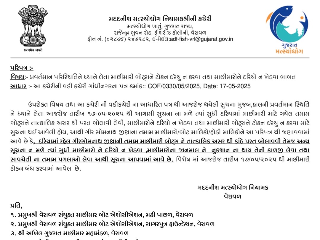 ગીર સોમનાથ જિલ્લાના તમામ માછીમારો, બોટ માલિકો અને હોડી માલિકોને આગામી સૂચના ન મળે ત્યાં સુધી દરિયો ન ખેડવા તાકીદ કરવામાં આવી છે. માછીમારોના જાન-માલની સુરક્ષાને ધ્યાનમાં રાખીને આ નિર્ણય લેવામાં આવ્યો છે. 17 મે, 2025થી માછીમારી ટોકન પણ બંધ કરવામાં આવ્યા છે.