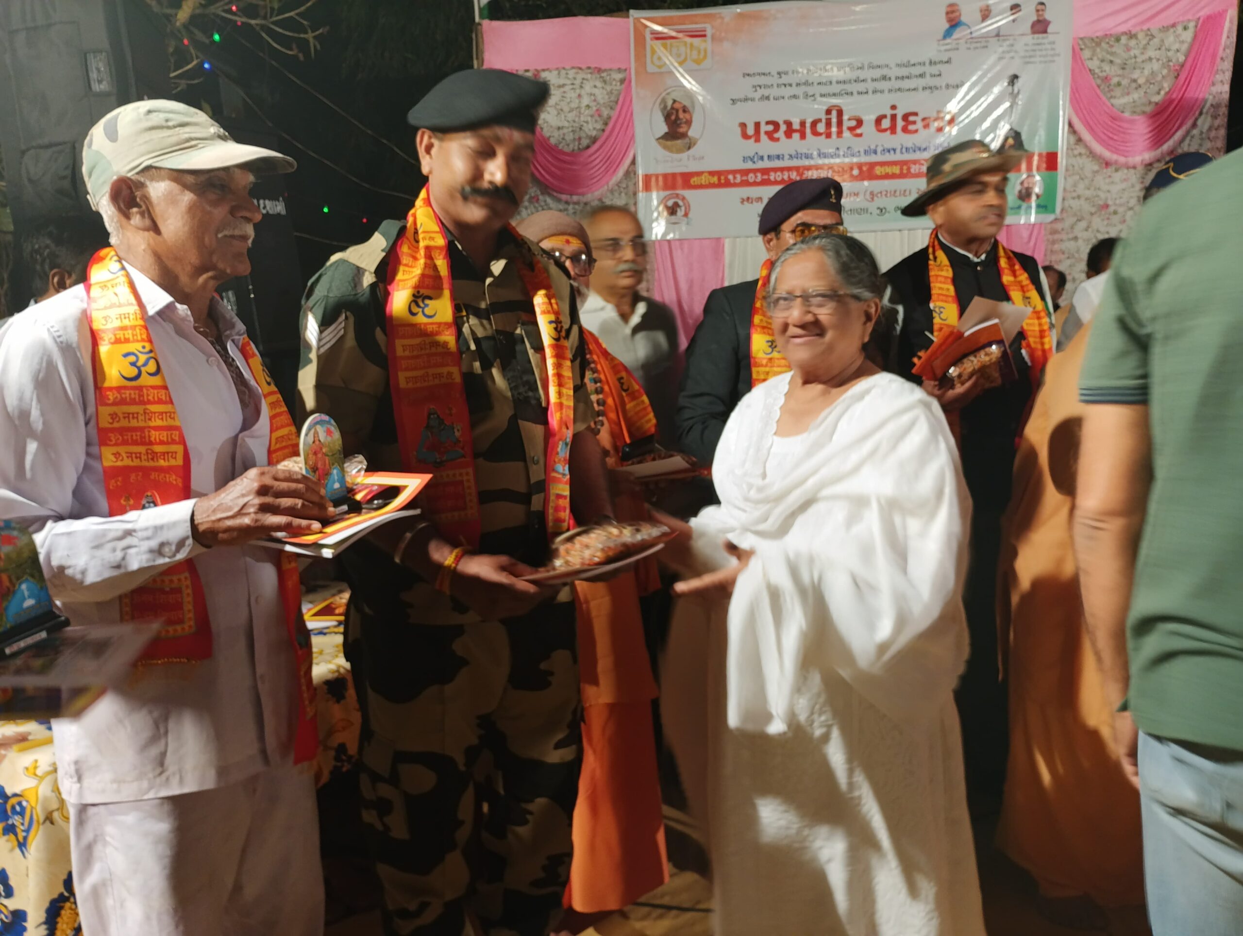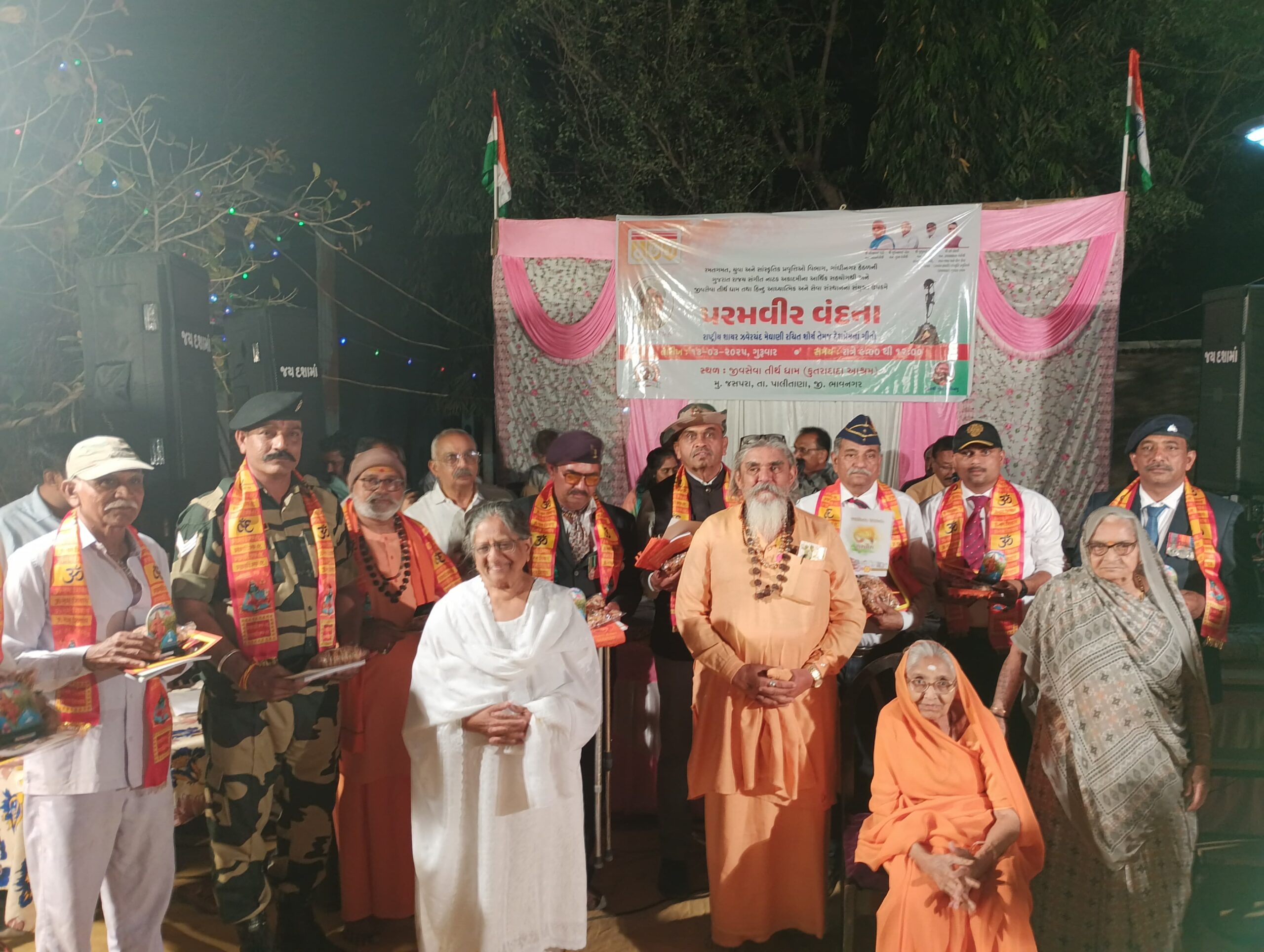 જીવ સેવા તીર્થ ધામ ખાતે યોજાયેલ પરમવીર વંદના કાર્યક્રમમાં ભાવનગર અને અમરેલી જીલ્લાના 30 જવાનો ઉપસ્થિત રહ્યા હતા અને વીરો ને વંદન કરી અશ્રુભીની શ્રધ્ધાજલી અર્પણ કરી હતી આતકે રાષ્ટ્રીય શાયર ઝવેરચંદ મેઘાણી રચિત શોર્ય અને દેશ ભક્તિના ગીતો રજુ કરવામાં આવ્યા હતા જેમાં જાણીતા આંતરરાષ્ટ્રીય લોક ગાયક શ્યામભાઈ મકવાણા, લોક ગાયીકા અનુશ્રીબેન ચુડાસમા, મેઘાણી સાહિત્યનાં વિદ્વાન વક્તા નરેશભાઈ મહેતા દેશભક્તિના ગીતો પીરસ્યા હતા.