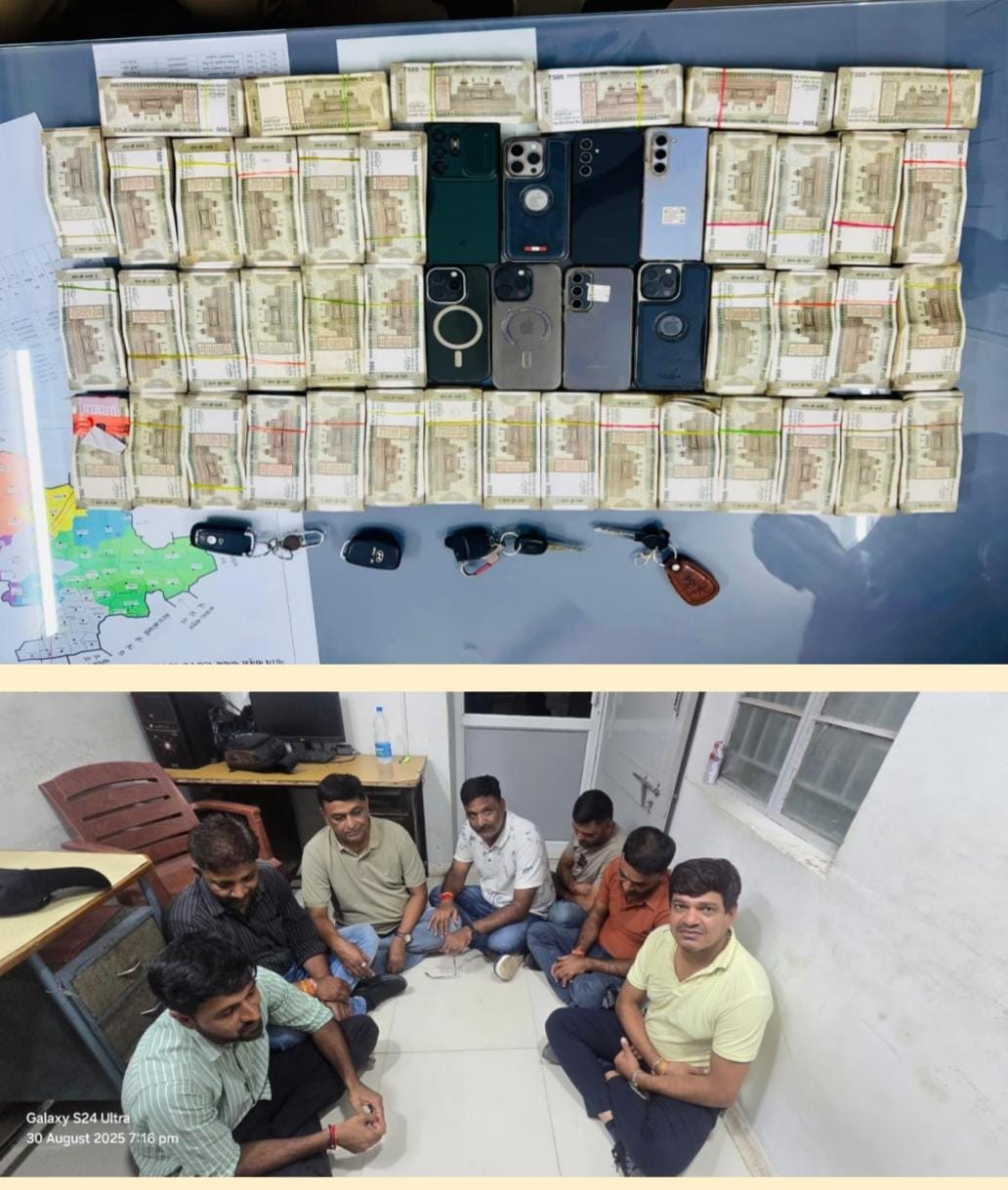 રાજકોટ શહેર તા.૩૧/૮/૨૦૨૫ ના રોજ રાજકોટ રેન્જ પોલીસ મહાનિરીક્ષક અશોકકુમાર યાદવ ની સુચના તથા પોલીસ અધિક્ષક વિજયસિંહ ગુર્જર રાજકોટ ગ્રામ્ય, નાયબ પોલીસ અધિક્ષક કે.જી.ઝાલા, ગોંડલ વિભાગ નાઓના તરફથી પ્રોહીબીશન-જુગારની ગેરકાયદેસર પ્રવૃતીઓ કરતા ઈસમો ઉપર નજર રાખી આવી પ્રવૃતીઓ કરતા ઈસમો વિરૂધ્ધ “Zero Tolerance to Prohibition & Gambling” ની નીતિ મુજબ કામગીરી કરી આવી પ્રવૃતીઓ નેસ્ત નાબુદ કરવા સુચના થયેલ હોય જે અન્વયે અમો ગોંડલ તાલુકા P.I એ.ડી.પરમાર ના માર્ગદર્શન મુજબ ગોંડલ તાલુકા પોલીસ સ્ટેશનના સર્વેલન્સ સ્ટાફના માણસો પેટ્રોલીંગમાં હતા તે દરમ્યાન ખાનગીરાહે, ચોક્કસ અને ભરોષાપાત્ર હકીકત મળેલ કે, ગોંડલ તાલુકાના ગુંદાસરા ગામની સીમમાં હીતેષભાઈ હરજીભાઈ મણવર રહે-રાજકોટ વાળાના “પ્રીમીયર એન્ટરપ્રાઈઝ” નામના કારખાનામાં અમુક ઇસમો તીનપતીનો હારજીતનો નસીબ આધારીત જુગાર રમે છે. જેથી તુરંત જ હકિકત વાળી જગ્યાએ રેઈડ કરતા ફૂલ-૭ ઇસમોને પકડી પાડી જુગારધારા અધિનીયમ મુજબ કાર્યવાહી કરવામાં આવેલ છે. (૧) લલીતભાઇ ચંદુભાઇ કાનેરીયા રહે.રાજકોટ અંબીકા ટાઉનશીપ. (૨) હીતેષભાઇ હરજીભાઇ મણવર રહે.રાજકોટ જગન્નાથ ચોક, વ્રજરત્ન એપાર્ટમેન્ટ. (૩) રમેશભાઇ વલ્લભભાઇ મારડીયા રહે.રાજકોટ આત્મીય કોલેજની સામે, શ્યામલ ફુટીર. (૪) પ્રતિકભાઇ જયંતીભાઇ ભુત રહે.રાજકોટ અંબીકા ટાઉનશીપ (૫) જેમીનભાઇ માધવજીભાઇ ઘેટીયા રહે.રાજકોટ અંબીકા ટાઉનશીપ. (૬) મનીષભાઇ દુર્લભજીભાઈ ચનીયારા રહે.ગોંડલ ગુંદાળા રોડ, શાંતીનગર. (૭) દીલીપભાઇ પ્રાગજીભાઇ અસોદરીયા રહે.રાજકોટ પેડક રોડ, ગુજરાત સોસાયટી. રોકડ રૂ.૨૦,૨૧,૦૦૦ મોબાઇલ ફોન નંગ-૮ જેની કુલ કિં.રૂા.૬,૮૫,૦૦૦ ફોર વ્હીલ કાર નંગ-૩ મોટરસાયકલ નંગ-૧ જેની કુલ કિં.રૂ.૫૫,૭૦,૦૦૦ મુદ્દામાલની કુલ કી.રૂ.૮૨,૭૬,૦૦૦ નો કબ્જે કરેલ હોય.