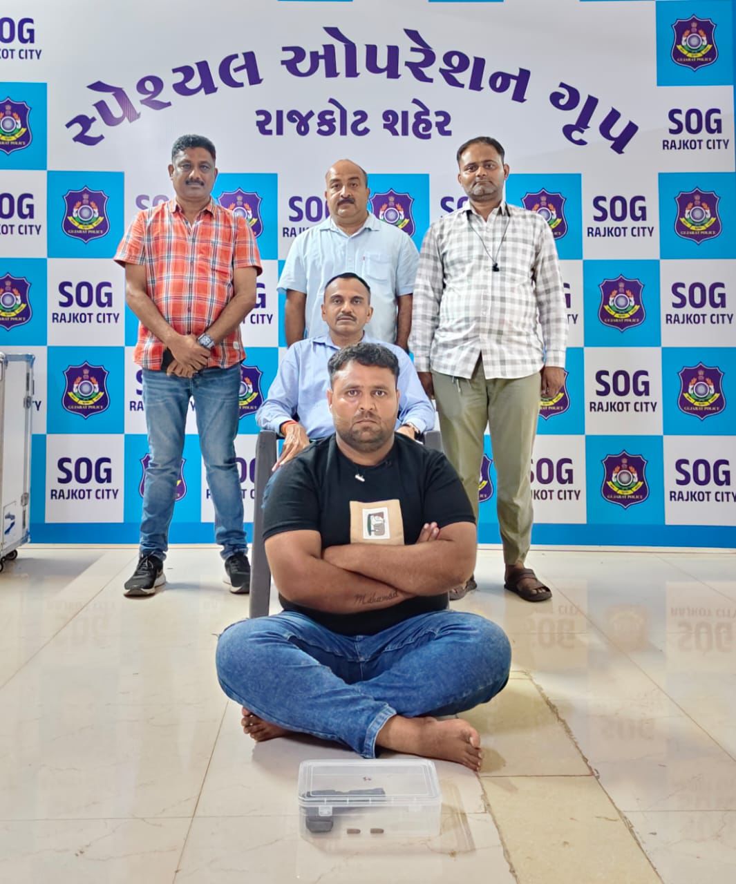 રાજકોટ શહેર તા.૨૧/૯/૨૦૨૫ ના રોજ રાજકોટ શહેરના સંવેદનશીલ વિસ્તારોમાં પેટ્રોલીંગ રાખી ગેરકાયદેસર હથીયાર ધરાવતા ઈસમો વિરુધ્ધ કડક કાર્યવાહી કરવા સુચના કરેલ હોય. જે અન્વયે P.I એસ.એમ.જાડેજા ના માર્ગદર્શન હેઠળ SOG શાખાના વી.વી.ધાંગુ તથા SOG શાખાના કર્મચારીઓ ગેરકાયદેસર હથીયાર ધરાવતા ઈસમોને શોધી કાઢવા સારૂ રાજકોટ શહેર વિસ્તારમાં પેટ્રોલીંગમાં હતા તે દરમ્યાન ફિરોજભાઈ રાઠોડ તથા હાર્દિકસિંહ પરમાર નાઓની સંયુકત બાતમી આધારે બેડી ચોકડીથી માધાપર ચોકડી તરફ જતા રોડ ઉપર કામધેનું ગૌશાળાની સામે જાહેર રોડ ઉપરથી ગેરકાયદેસર દેશી બનાવટની પિસ્ટલ તથા જીવતા કાર્ટીસ સાથે ઇસમને પકડી પોલીસ સ્ટેશન ખાતે ગુન્હો દાખલ કરવામાં આવેલ છે. મુસ્તાક અયુબભાઈ માલાણી ઉ.૩૨ રહે-પોપટપરા મિયાણાવાસ ૧૫/૧૬ નો ખુણો રાજકોટ. એક દેશી બનાવટની પિસ્ટલ નંગ-૧ કિ.૧૦,૦૦૦ એક્ટીવા મોટરસાયકલ કિ.૫૦,૦૦૦ પ્ર.નગર પો.સ્ટે. ૭/૨૦૧૯ આર્મ્સ એકટ કલમ ૨૫(૧-બી)એ મુજબ ગુનો દાખલ કરેલ હોય.