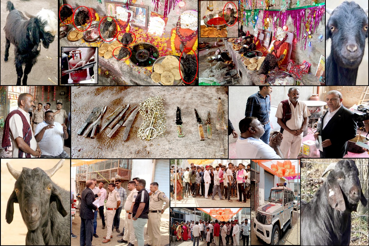 ફોટો તસવીર: રાજકોટ ગોંડલ ચોકડી પાસે, માંડવામાં પશુબલીની તસવીરમાં બોકળાના માથા, ધાર્મિક સ્થાન, ભુવા, અને તિક્ષ્ણ હથિયારો ઉપરાંત જાથાના જયંત પંડયા અને પોલિસ સ્ટાફ અને શ્રધ્ધાળુઓ નજરે પડે છે.