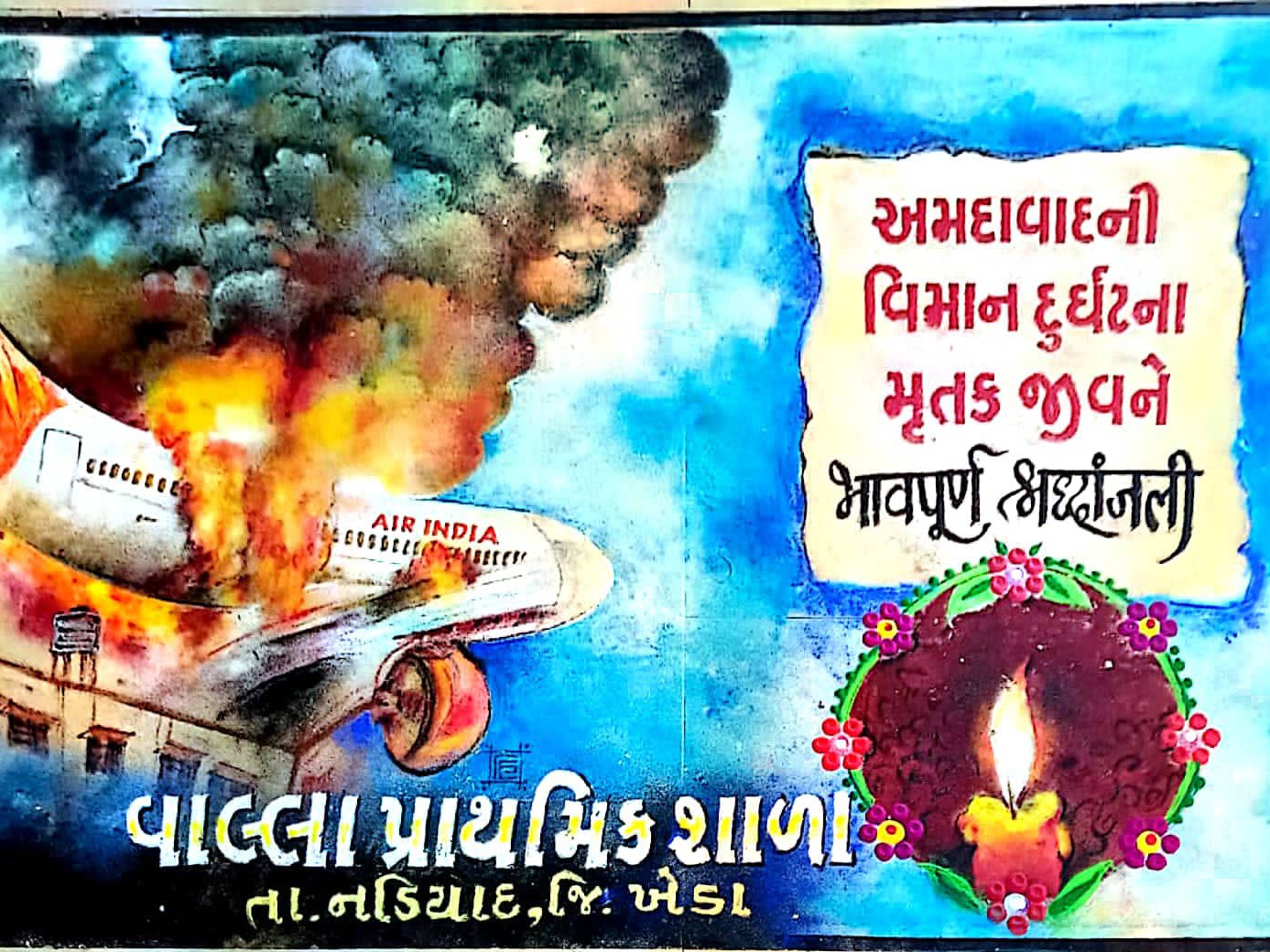 નડિયાદ તાલુકાના વાલ્લા પ્રાથમિક શાળાએ તાજેતરની અમદાવાદ વિમાન દુર્ઘટનામાં મૃત્યુ પામેલા લોકોને અનોખી રીતે શ્રદ્ધાંજલિ આપી છે.