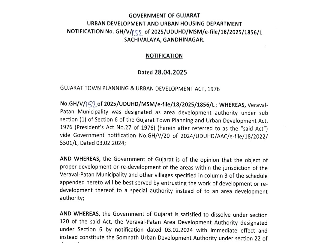 શહેરી વિકાસ અને ગૃહ નિર્માણ વિભાગ, ગાંધીનગરે આ અંગેનું નોટિફિકેશન જાહેર કર્યું છે. સુડાની રચનાને લઈ હવે સોમનાથ મંદિર અને વેરાવળ-પાટણના વિકાસ માટે અલગ વિકાસ સત્તા મંડળ કાર્યરત થશે.