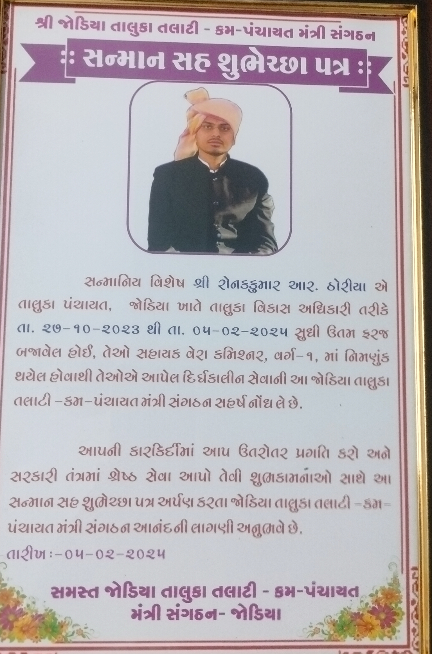 તારીખ 29/1 /2025 ના રોજ માન. તાલુકા વિકાસ અધિકારી સાહેબ શ્રી રોનકકુમાર ઠોરીયા સાહેબનો વિદાયમાન કાર્યક્રમ તાલુકા પંચાયત સ્ટાફ તથા તલાટી કમ મંત્રી મંડળ દ્વારા સંયુક્ત રીતે યોજવામાં kgabar.jam@gmail.com આવ્યો. આ કાર્યક્રમ તાલુકા પંચાયત જોડિયાના ઉપપ્રમુખ શ્રી મંગાભાઈ ધ્રાંગીયાના અધ્યક્ષ સ્થાને શરૂ કરવામાં આવેલ,આ કાર્યક્રમમાં તાલુકા પંચાયત જોડીયા ના કારોબારી ચેરમેન સામાજિક ન્યાય સમિતિના ચેરમેન તેમજ તાલુકા પંચાયતના પદાધિકારીશ્રીઓ, જોડીયા મામલતદાર સાહેબ, ધ્રોલ તાલુકા વિકાસ અધિકારી સાહેબ તેમજ આગેવાન શ્રીઓ અને બહોળી સંખ્યામાં પંચાયત સ્ટાફગણ હાજર રહેલ.